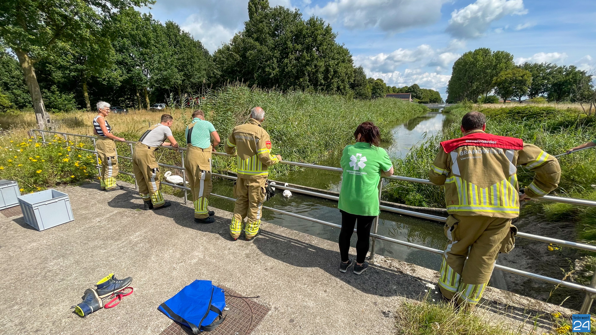 De dierenambulance werd getipt door een oplettende voorbijganger. De brandweer kwam met waadpakken ter plaatsen om een helpende hand te bieden. De zwanen werden over een betonnen rand geholpen waarna ze hun weg konden vervolgen.