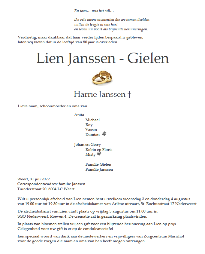 Lieve Lien, rust zacht. Kinderen en klein kinderen, sterkte om dit verlies een plekje te geven. Mooie herinneringen pakt niemand je af.