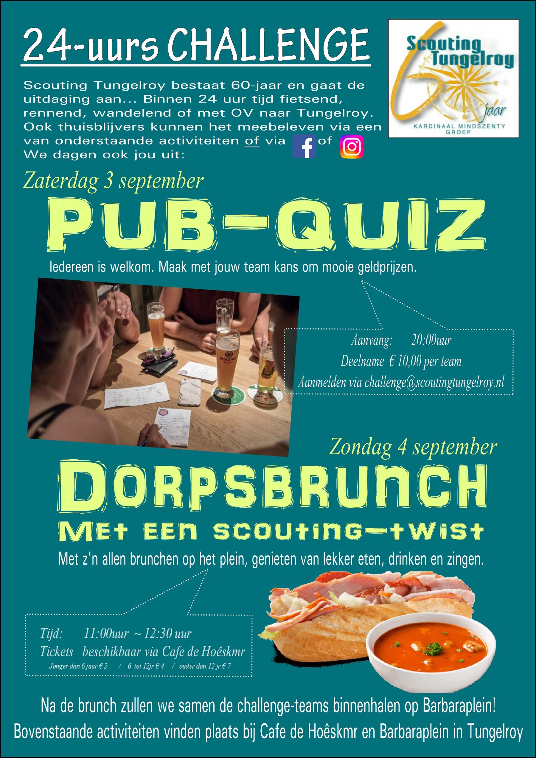 Maar natuurlijk is er voor de thuisblijvers ook een challenge. Op zaterdagavond wordt een echte Scouting PUB-QUIZ georganiseerd. Vragen over de Tungelderse Well, Scouting Tungelroy, Rooj en Tungelder en natuurlijk algemene vragen over Nederland, historie en de rest van de wereld. Een gezellige avond met presentatie van Hopman Sjaak en die muzikaal ondersteund wordt door D.J. Baloe. Doe mee met oude kameraden van je patrouille of welpen-nest of met de achterbuurvrouw of buurman van ‘schuin-tegenover’. Beleef de challenge op je eigen wijze.