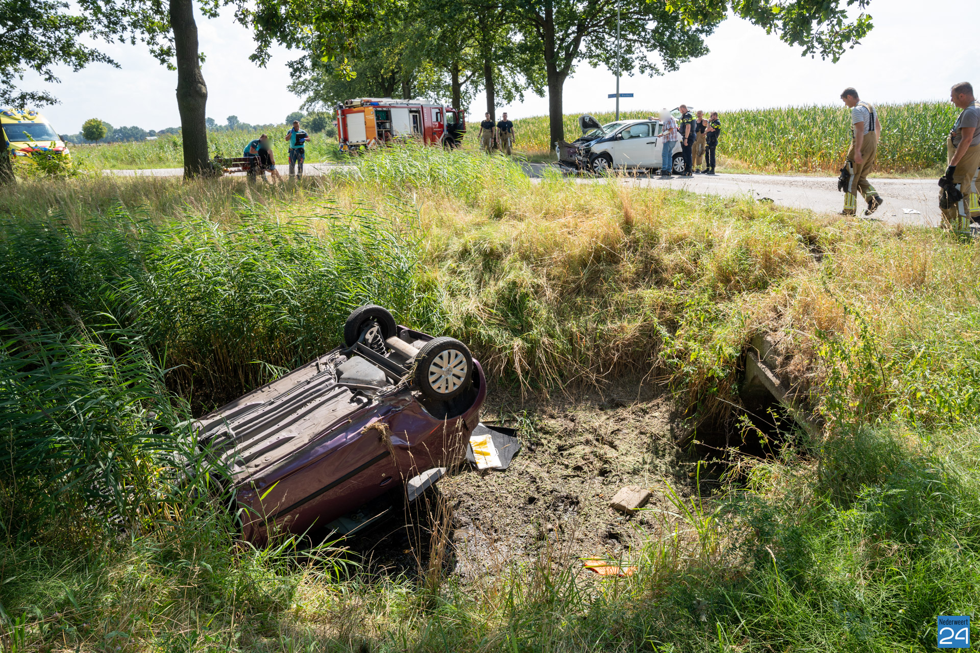 Eén van de twee personenauto’s kwam op de kop in de nabijgelegen sloot terecht. De vrouw kon op eigen kracht haar voertuig verlaten. Zij, én de bestuurder van het andere voertuig, zijn ter plekke door ambulancemedewerkers nagekeken en behandeld. Ze hoefden niet naar het ziekenhuis worden gebracht.