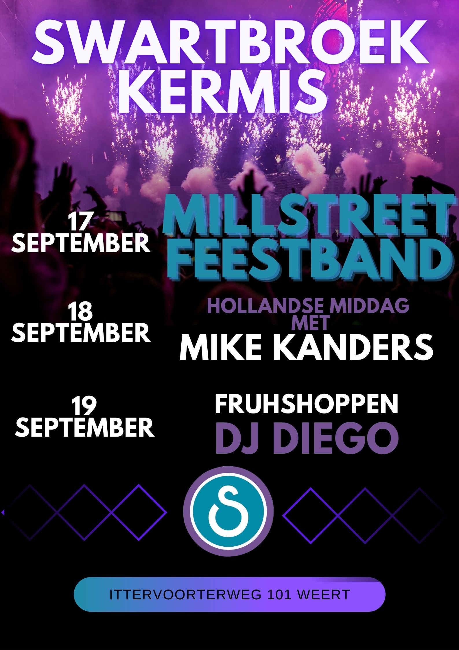 Op 17 september staat Feestband Millstreet op het podium in Swartbroek. Voor het eerst sinds jaren speelt er een band midden op de straat. Het feest barst los vanaf 20.30 uur! Wil je mee met de bus vanuit Ospel, Nederweert of Weert? Stuur een appje naar 0628351631.