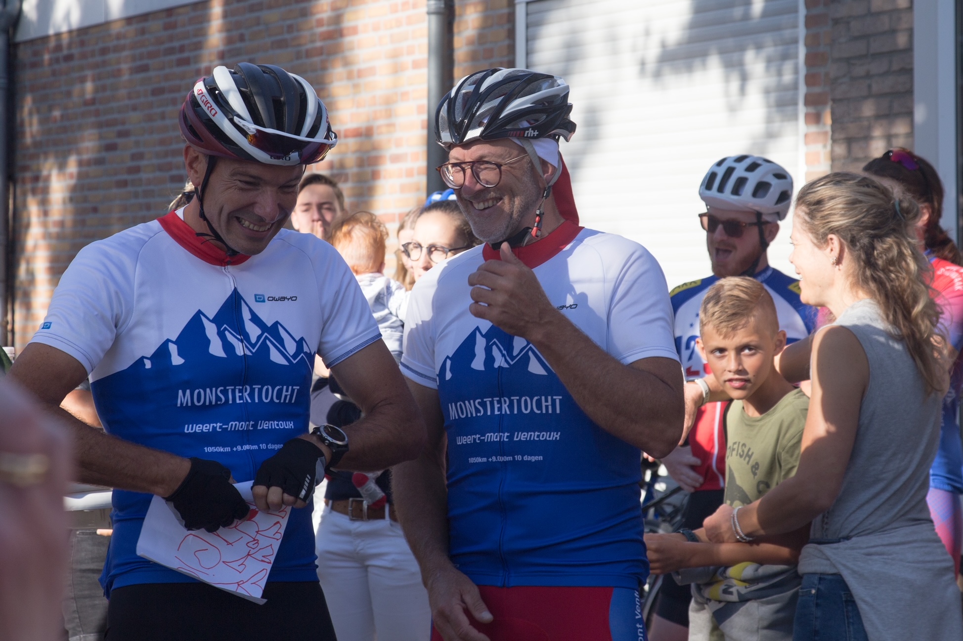 Frank van Engelen en Cees Kersten, beiden lid van de Toons Jubileum Toppers van het Toon Hermans Huis Weert e.o., vertrokken zondagmorgen 21 augustus voor een ‘monster(fiets)tocht‘ van 1050 km naar de Mont Ventoux. Daarmee willen zij er de aandacht op vestigen dat vanuit het Toon Hermans Huis Weert tien jaar geleden de eerste Toons Toppers de berg hebben beklommen. Bovendien zamelen zij extra geld in voor kankeronderzoek via het KWF en voor het Toon Hermans Huis.
