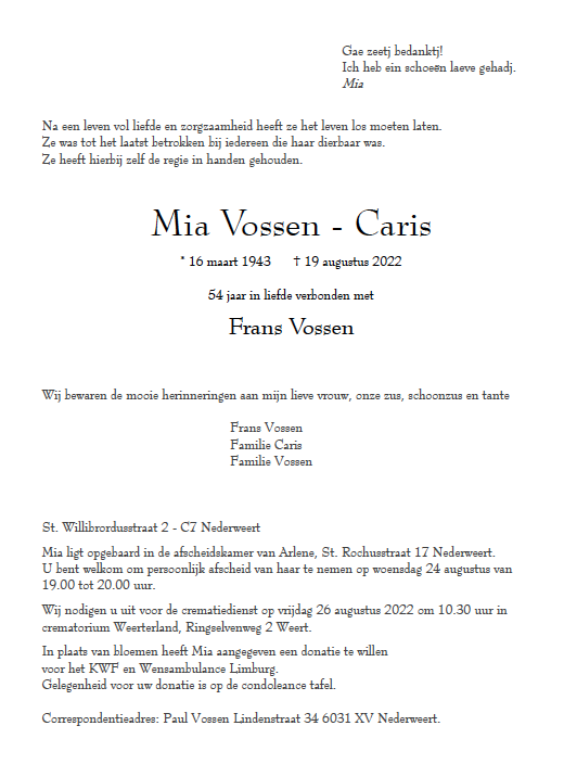 9. Frans familiel Vossen en Familie Caris gecondoleerd met het verlies van Mia wij wensen jullie veel sterkte met dit verlies.Wiel en Rina Mackus.