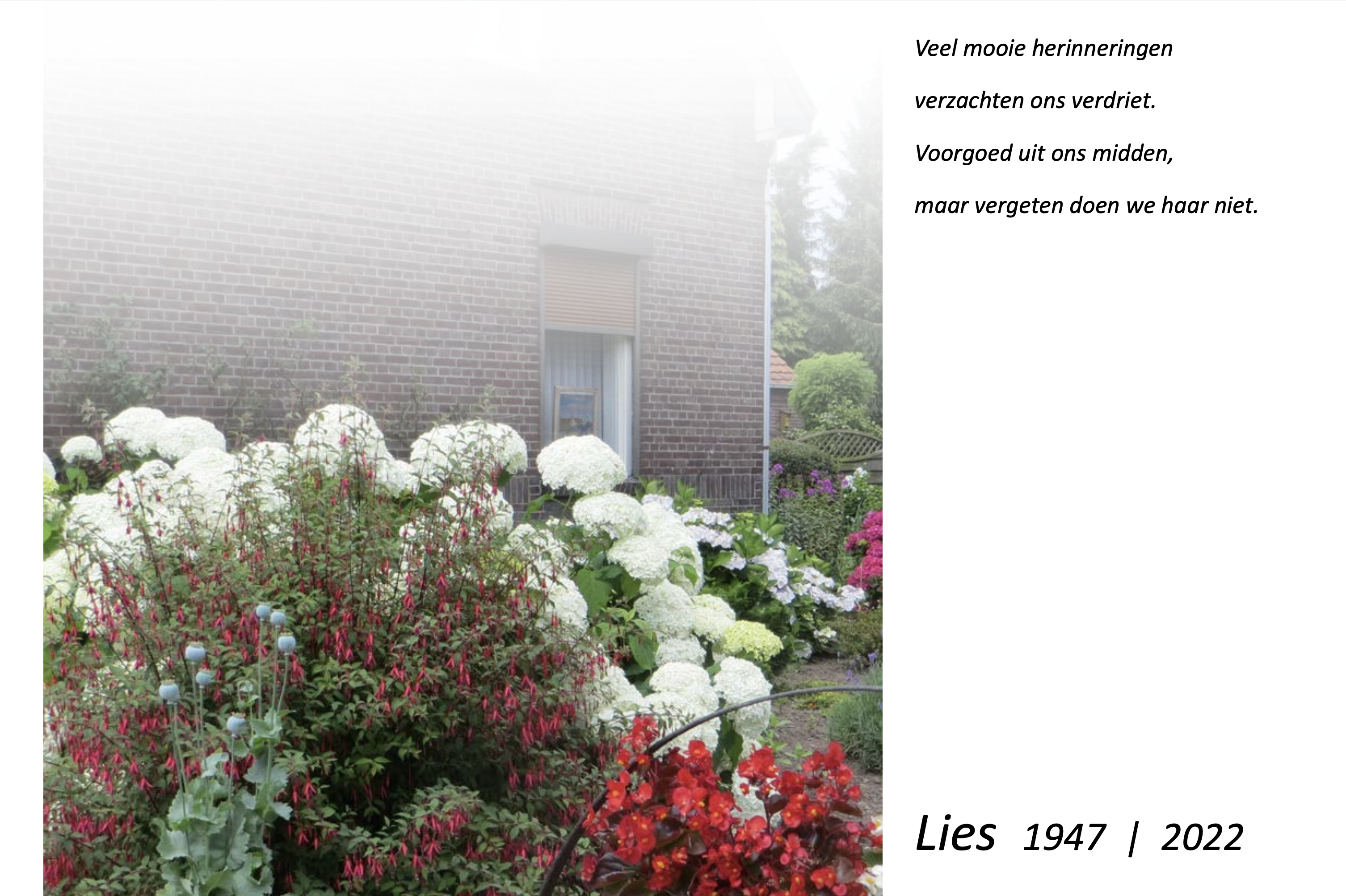 Wij blijven jou herinneren als de altijd vrolijke Lies.