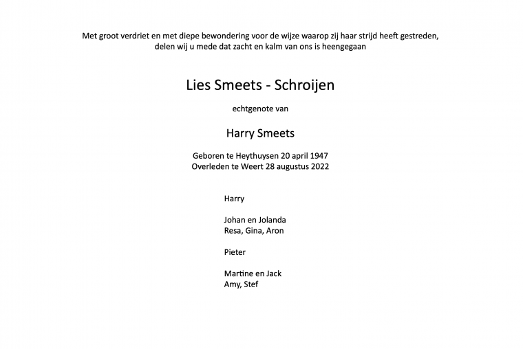 Overlijdensbericht: Lies Smeets – Schroijen †