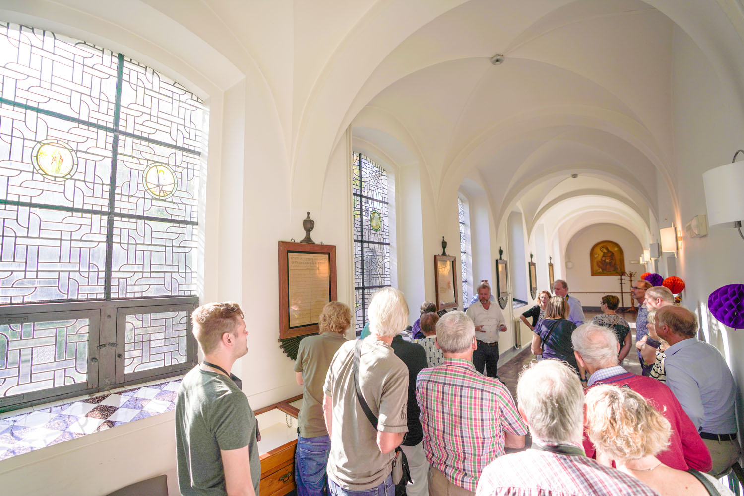De rondleiding start met een bezoek aan een voormalige grafkelder met daarin een mergelstenen muur, een fundament van het voormalige ‘kasteel’ de Aldenborgh. Daarna bezoek je de kerk. Daar bevindt zich o.a. een neogotisch monument voor de twee Weerter Heiligen Hieronymus en Antonius, Martelaren van Gorcum die in 1572 (dit jaar 450 jaar geleden) werden gemarteld en vermoord. Een ontwerp van architect Pierre Cuypers. Aansluitend loop je naar het (priester)koor met het 17de eeuwse hoogaltaar en achtergelegen kapellen. Ook bezoek je de zolder om de bijzondere gewelven te bekijken. De tuin wordt niet overgeslagen, met de voormalige werkhuizen en brouwerij langs de 13de eeuwse slotgracht.