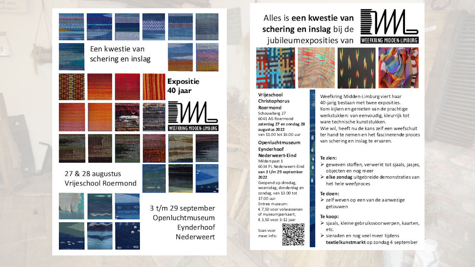 Weefkring Midden-Limburg viert haar 40-jarig bestaan met twee exposities. De eerste expositie staat op 27 & 28 augustus in de Vrijeschool te Roermond en de tweede expositie staat van 3 tot 29 september in het Limburgs Openluchtmuseum Eynderhoof.