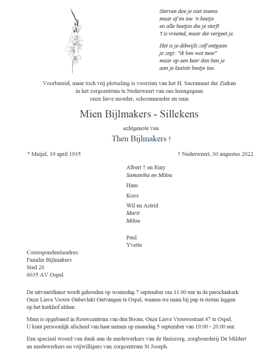 Overlijdensbericht: Mien Bijlmakers – Sillekens †
