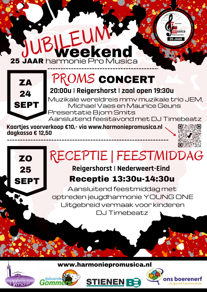 Harmonie Pro Musica uit Nederweert-Eind bestaat dit jaar 25 jaar. En dat vieren ze met een jubileumweekend op zaterdag 24 en zondag 25 september! Een harmonie brengt mensen samen en is een verbindende factor in het dorp. De muzikale klanken zijn een lust voor het oor, heerlijk om van te genieten en vaak ontroerend. De leden van de harmonie vinden het dan ook fijn om mensen te verrassen met een serenade, zoals bijvoorbeeld bij de lintjesregen in april, jubilea van een huwelijk of anderszins. Ook presenteren zij zich graag tijdens het jaarlijks terugkerende zomerconcert in openluchtmuseum Eynderhoof en met Allerheiligen. Maar ook het eigen jubileum willen ze graag met jou vieren. Ze zijn dan ook verheugd jou te mogen uitnodigen voor de receptie en feestmiddag ter gelegenheid van ons 25-jarig jubileum. En daar zijn ze trots op!