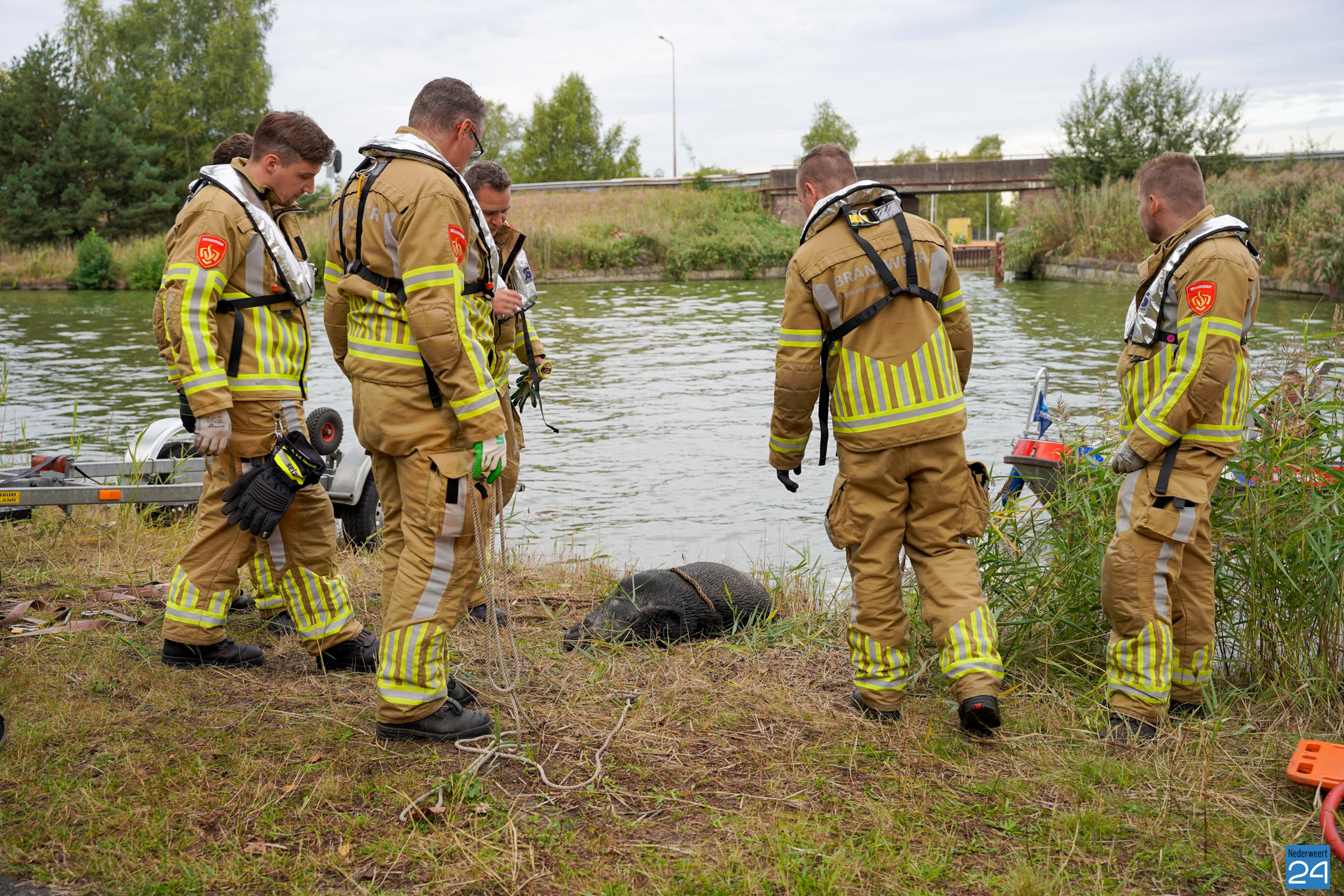 Heerlijk, wildzwijnbiefstukjes, hebben de brandweermannen weer mazzel…er zijn trouwens veel plekken waar dieren in- en uit het kanaal kunnen, ik denk dat dit een oud en versleten zwientje was…