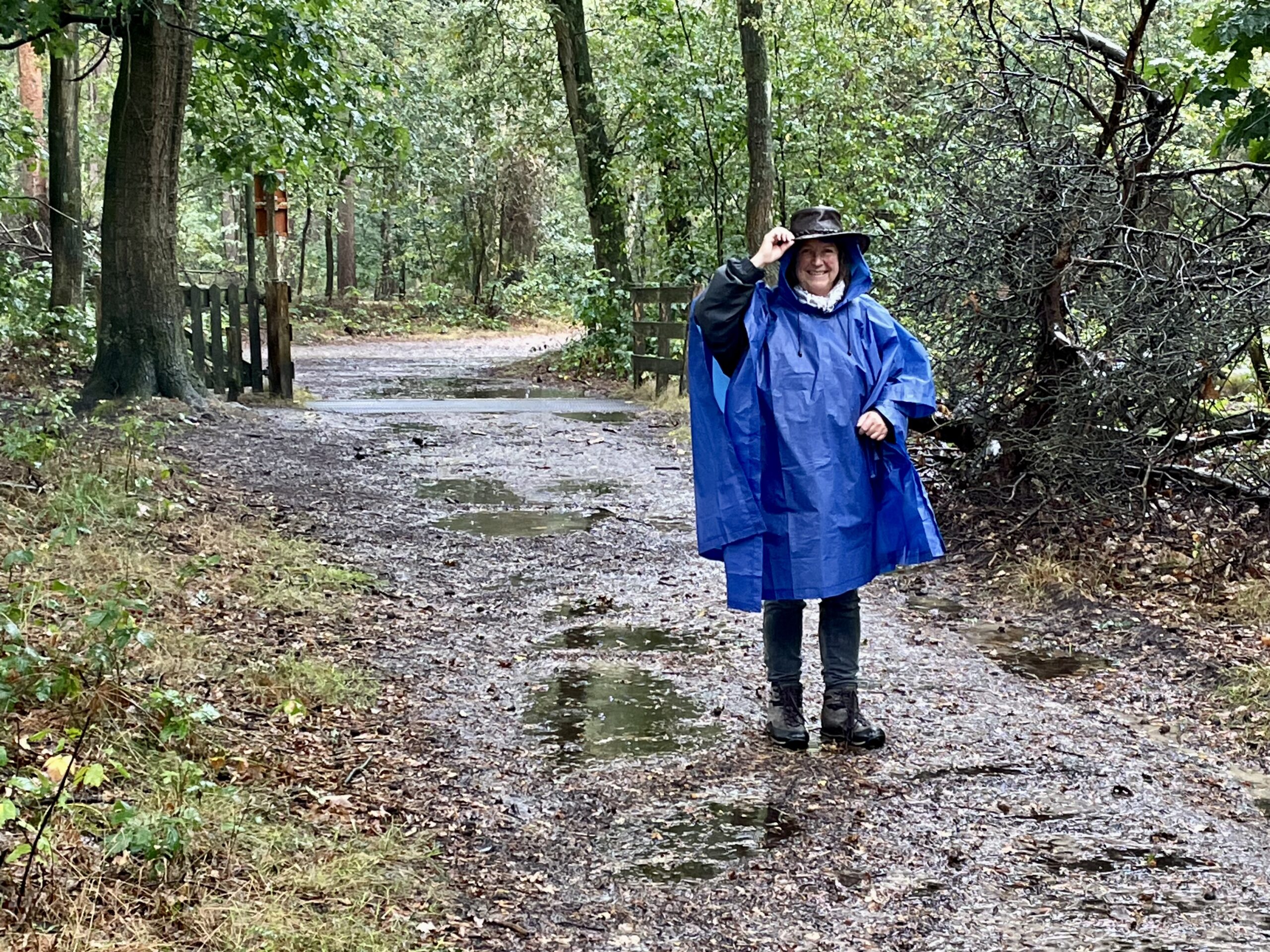 Ook als het regent trek ik erop uit. Dan maak ik tijd, ook als ik denk geen tijd te hebben. De ervaring heeft me geleerd dat het me helpt om niet verstrikt te raken in hersenspinsels. Dus trek ik mijn jas aan, neem mijn poncho mee en hoed en ga naar het bos voor een wandeling. Tijdens het wandelen hou ik even halt en plaats alle zorgen die er waren weer op de voorgrond op een manier zoals we dat met mindfulness doen. En dan merk ik dat het steeds verder naar de achtergrond verdwijnt zonder dat ik daarin stuur. En ondanks de dikke wolken waaruit de regen valt, klaart het voor mij dan weer op. Dan ruik ik de geur van het natte bos. Ik hoor de regen tikken op mijn hoed en voel de temperatuur van de druppels op mijn handen. Ik zie hoe sommige bospaden in kleine riviertjes zijn veranderd en kijk naar de kleuren van leven en verval om me heen.