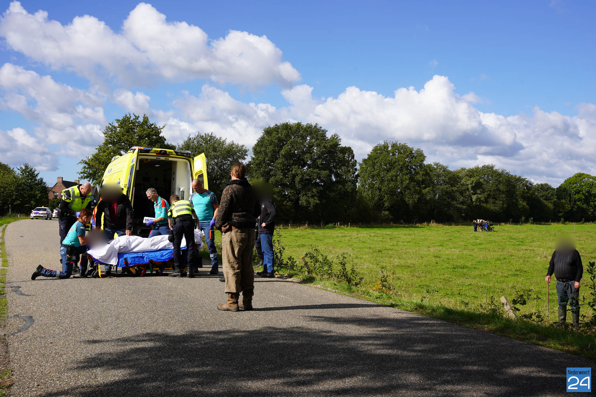 Een van de slachtoffers kwam er met een pijnlijke schouder vanaf, maar hoefde niet verder onderzocht te worden. Het andere slachtoffer was er minder goed aantoe en is per ambulance overgebracht naar het ziekenhuis. De paarden zijn veilig uit de wei gehaald.