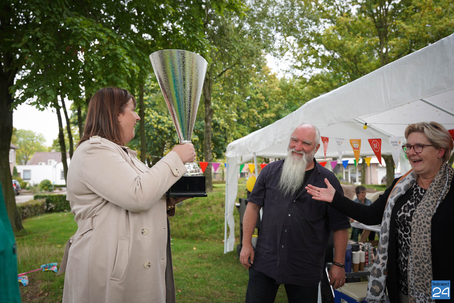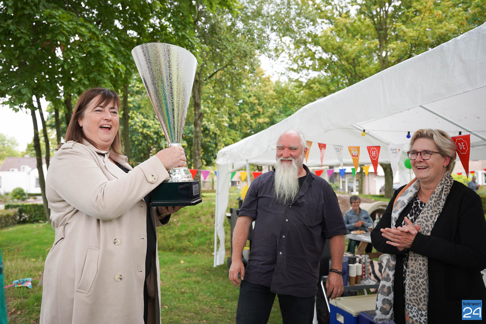 De welverdiende wisseltrofee werd dankbaar in ontvangst genomen. Ook ontvingen de bewoners een waardebon die ze naar wens kunnen verzilveren, om de saamhorigheid en de onderlinge contacten vast te houden.