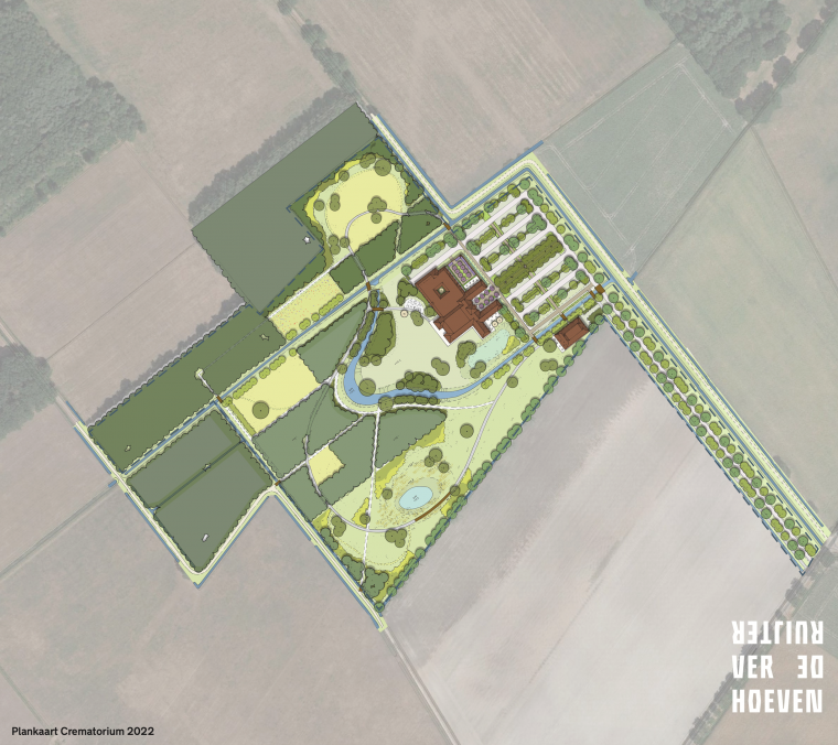 Bij goed weer kan de plechtigheid in de openluchtaula plaatsvinden, sfeervol tussen de bomen. Buiten is ook de uitgestrekte natuurbegraafplaats, omgeven door strooivelden en velden met gedenkbomen en gedenkschijven. Verder komt er op het terrein een Theehuis; een klein horecapaviljoen voor wandelaars, fietsers en bezoekers van het crematorium. “Het meest bijzondere aan dit plan is de locatie. De ruimte en de stilte van de natuur. Na de crematieplechtigheid kun je nog even rustig over het terrein wandelen of een kopje koffie drinken in het paviljoen.”