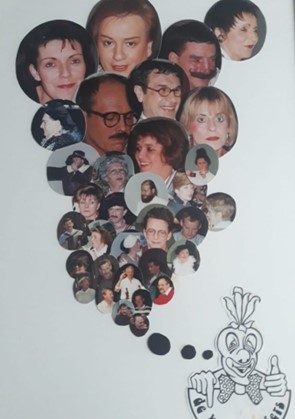 Mien: “Zodra de Krottepoffers binnenkwamen in de Pinnenhof was het meteen gezellig, zowel bij repetities als bij de voorstellingen. Dat moet ook wel, anders kun je de samenwerking met verenigingen niet volhouden.” Jantje had het meeste contact met de spelers, hij zorgde er altijd voor dat ze in de kelder niets tekort kwamen. Zelf is Mien ook wel eens gaan kijken in de kelder. “Dat schminken is toch wel heel kunstig, hiervan was ik altijd erg onder de indruk.” Zodra we het hebben over wie die groep Krottepoffers dan waren, snelt ze naar boven om een collage te halen. “Gekregen van de Krottepoffers toen Jan 50 is geworden”, vertelt ze trots. Hieruit blijkt ook de fijne samenwerking die er was tussen de Krottepoffers en het beheerdersechtpaar. Hierop staan vele spelers van het eerste uur en Mien kent ze nog bijna allemaal van naam.