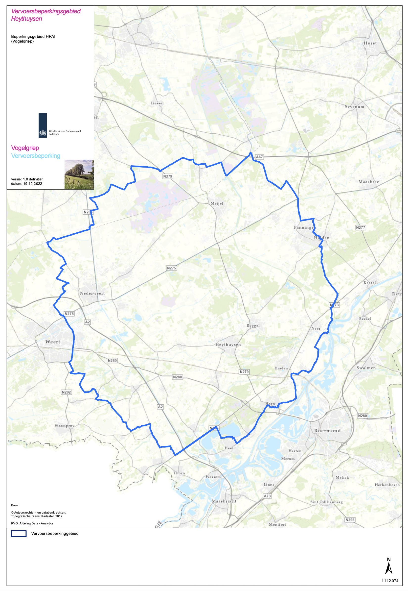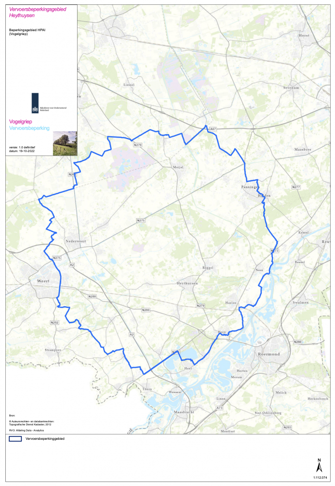 Omdat het besmette bedrijf in een pluimveedichtgebied ligt – en om het risico op verdere verspreiding zo klein mogelijk te houden – geldt ook een vervoersverbod voor risicovogels in de ‘regio 19’ die hierbij aansluit (zie de RVO dierziektenviewer voor de betreffende regio). Deze maatregel gold al in het gebied vanwege de besmetting in het nabijgelegen Ospel en gaat nu opnieuw voor 14 dagen in. Op dit vervoersverbod geldt, onder strikte voorwaarden, een uitzondering voor vervoer naar de slacht en het vervoer van eendagskuikens.