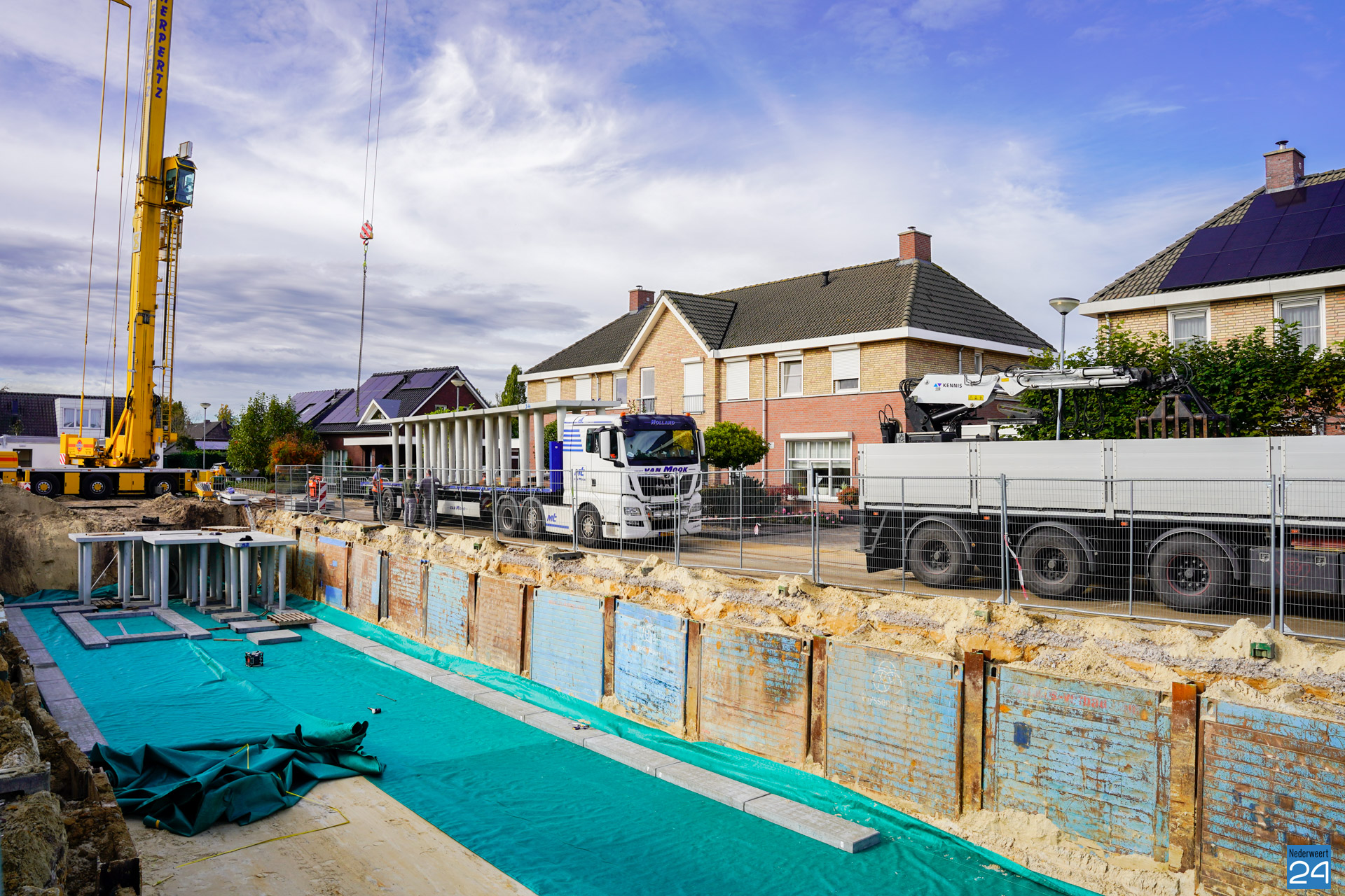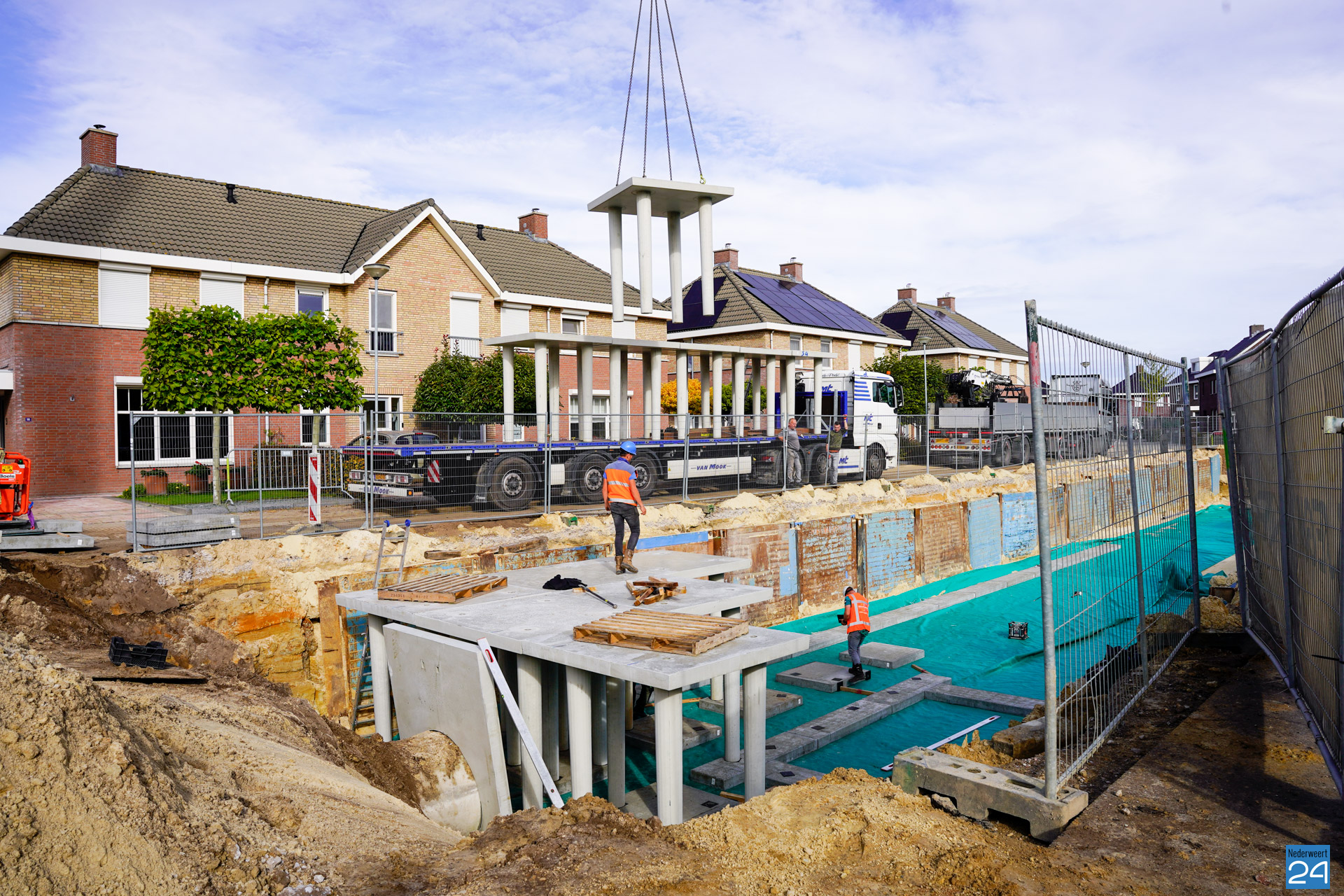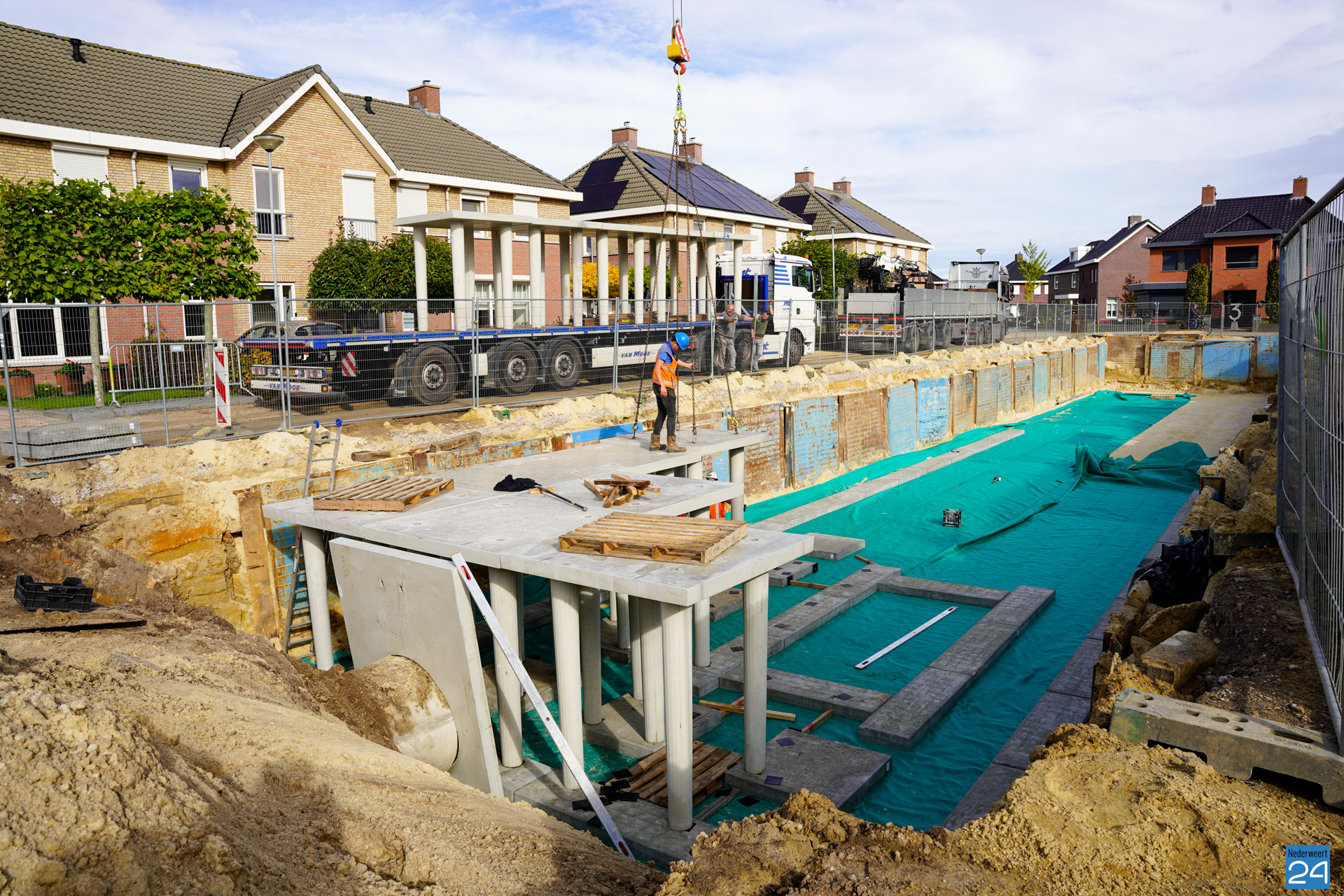 Sinds enkele weken is er een enorm gat te zien aan de Meester Schakenhof in Ospel. Men is daar bezig met de realisatie van een waterkelder. Het graven zit erop, en sinds vrijdag wordt de waterbuffer opgezet. De operatie brengt flink wat bekijks met zich mee.