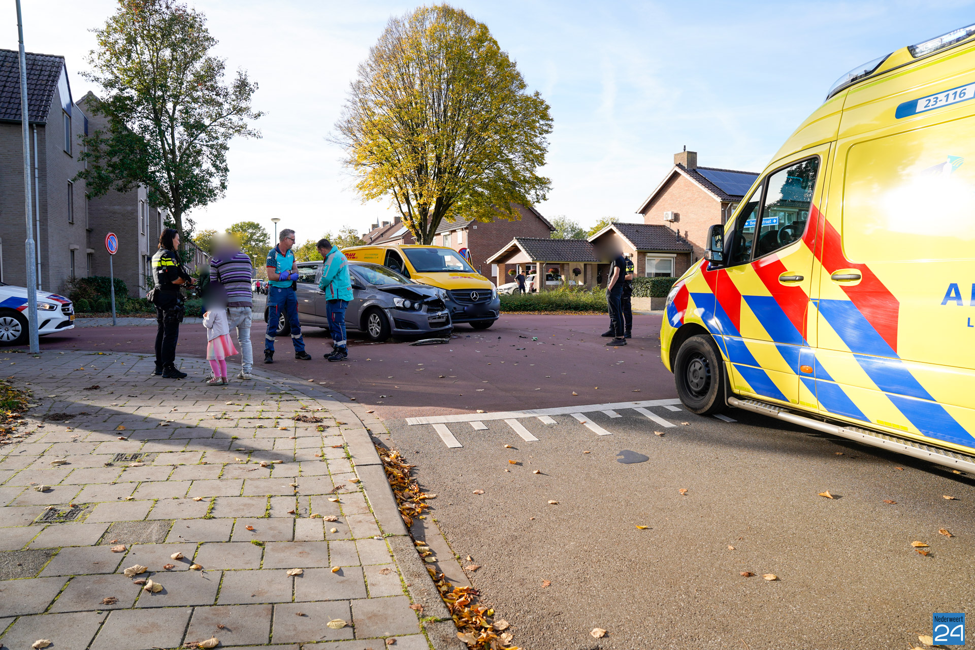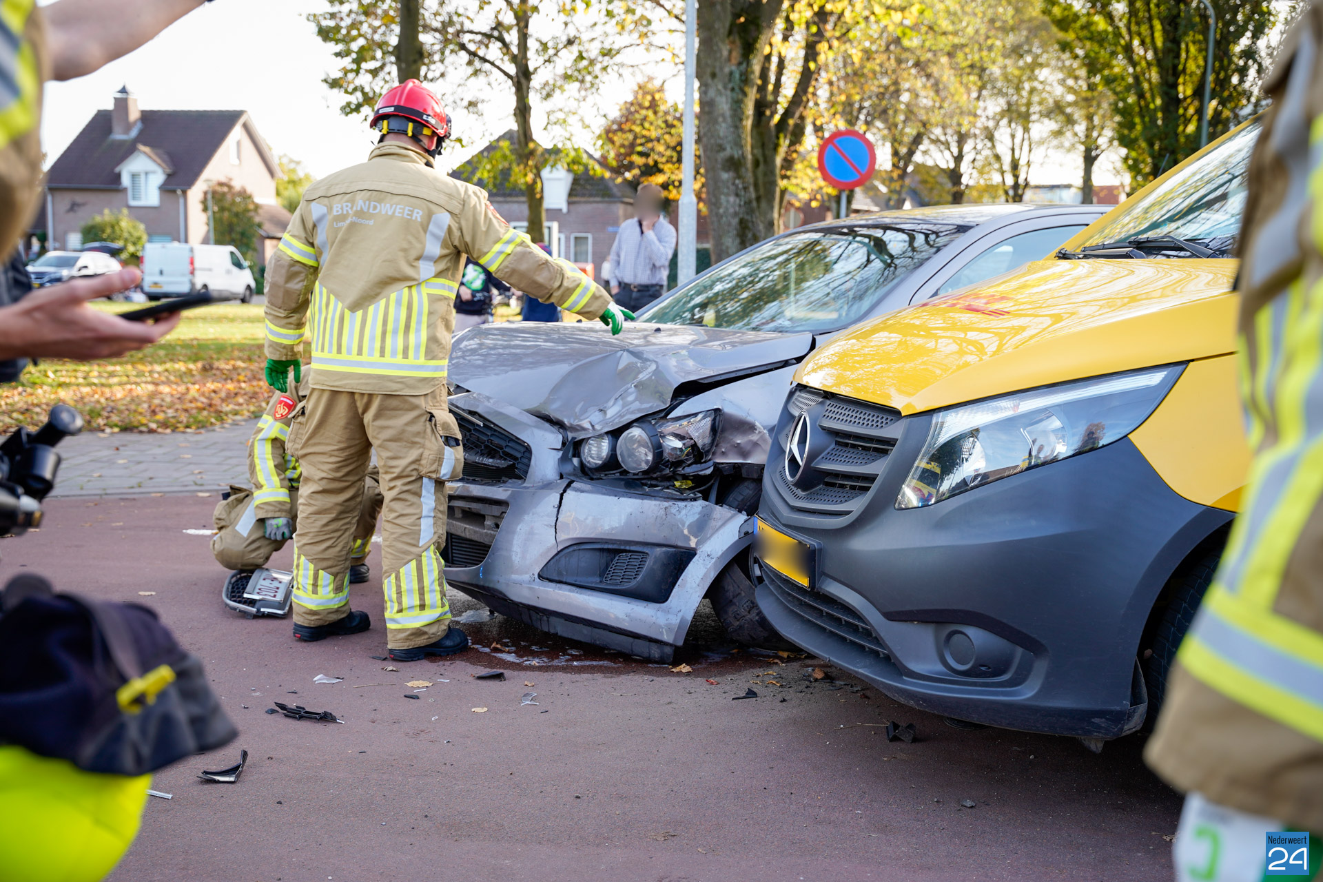 Brandweer, politie en een ambulance kwamen ter plaatse voor hulpverlening. Zover bekend raakte er niemand gewond. Een pakketbezorger kwam door, mogelijk een voorrangsfout, met een personenauto in botsing. Beide voertuigen raakten flink beschadigd.