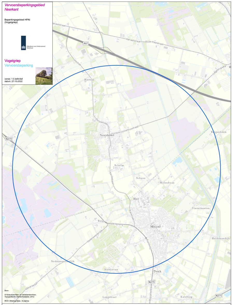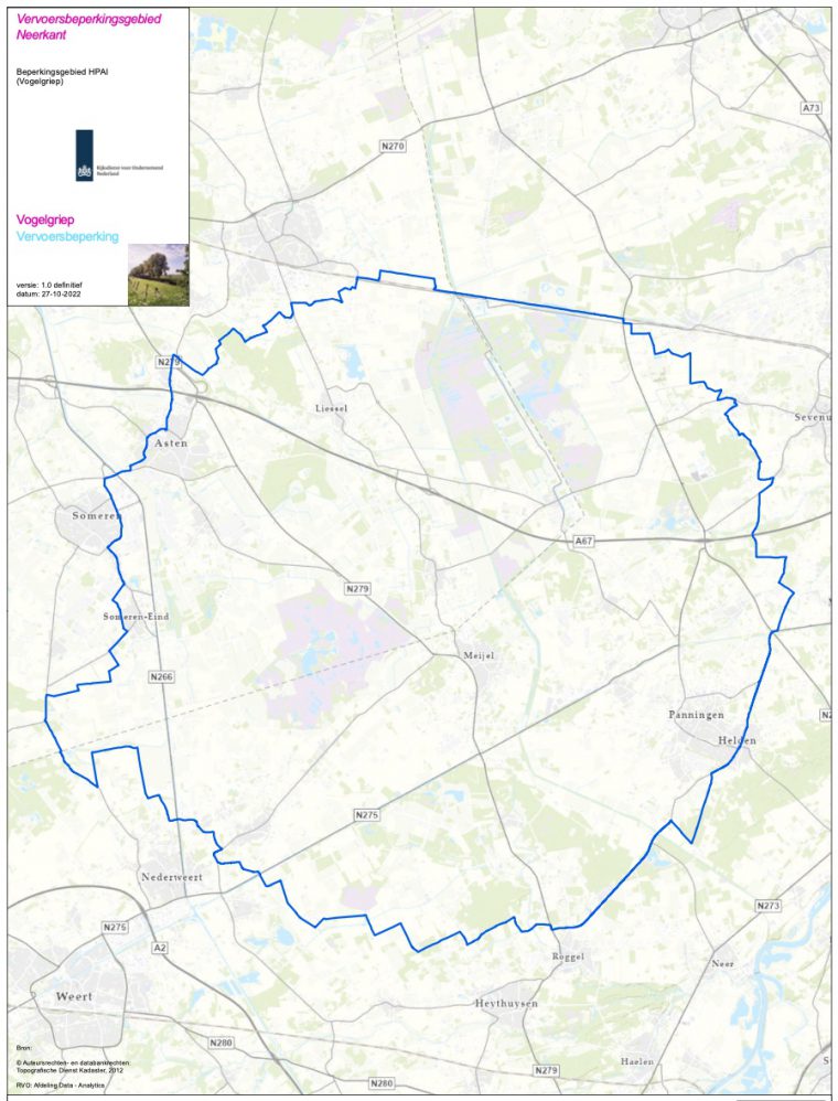 Binnen 3 kilometer bevinden zich vijf andere bedrijven met pluimvee. Deze worden bemonsterd op vogelgriep en de komende 14 dagen intensief gemonitord op ziekteverschijnselen die op vogelgriep kunnen wijzen. In de 10 kilometerzone liggen 83 andere pluimveebedrijven. In dit gebied geldt per direct het vervoersverbod. Het besmette bedrijf ligt op de grens van de 10 km zone van het eerder besmette bedrijf in Ospel en middenin de 10 km zone van het bedrijf in Heythuysen. De helft van het totale 10 km gebied rondom het bedrijf in Neerkant heeft overlap met andere beperkingszones.