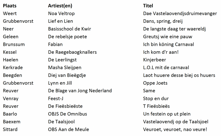 Het (nieuwe) KVL bestuur is blij met de inschrijvingen uit de gehele provincie, van zuid tot noord. Opvallende afwezigen zijn misschien wel (groot) Venlo en Maastricht. Twee belangrijke “vastelaoves-steden” met een levendige liedjescultuur. Anderzijds is de deelname van de Taalschool van het A.Z.C. te Baexem zeker vernoemenswaardig, wat de diversiteit van het deelnemersveld extra ondersteunt.