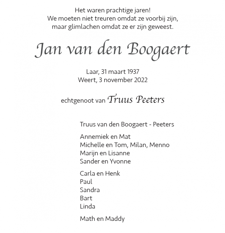 Gecondoleerd met het verlies van Jan truus kinderen en kleinkinderen sterkte met dit verlies