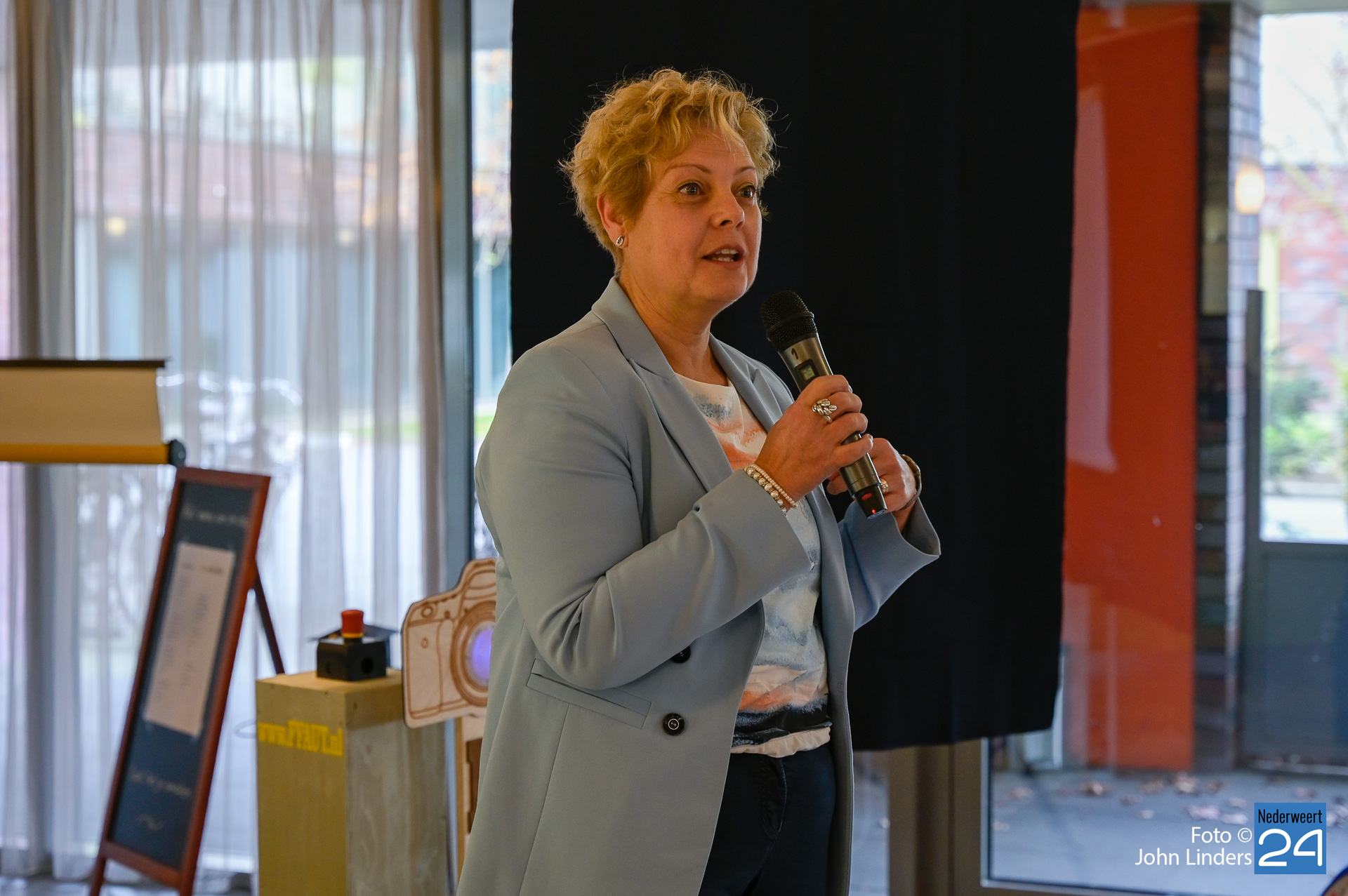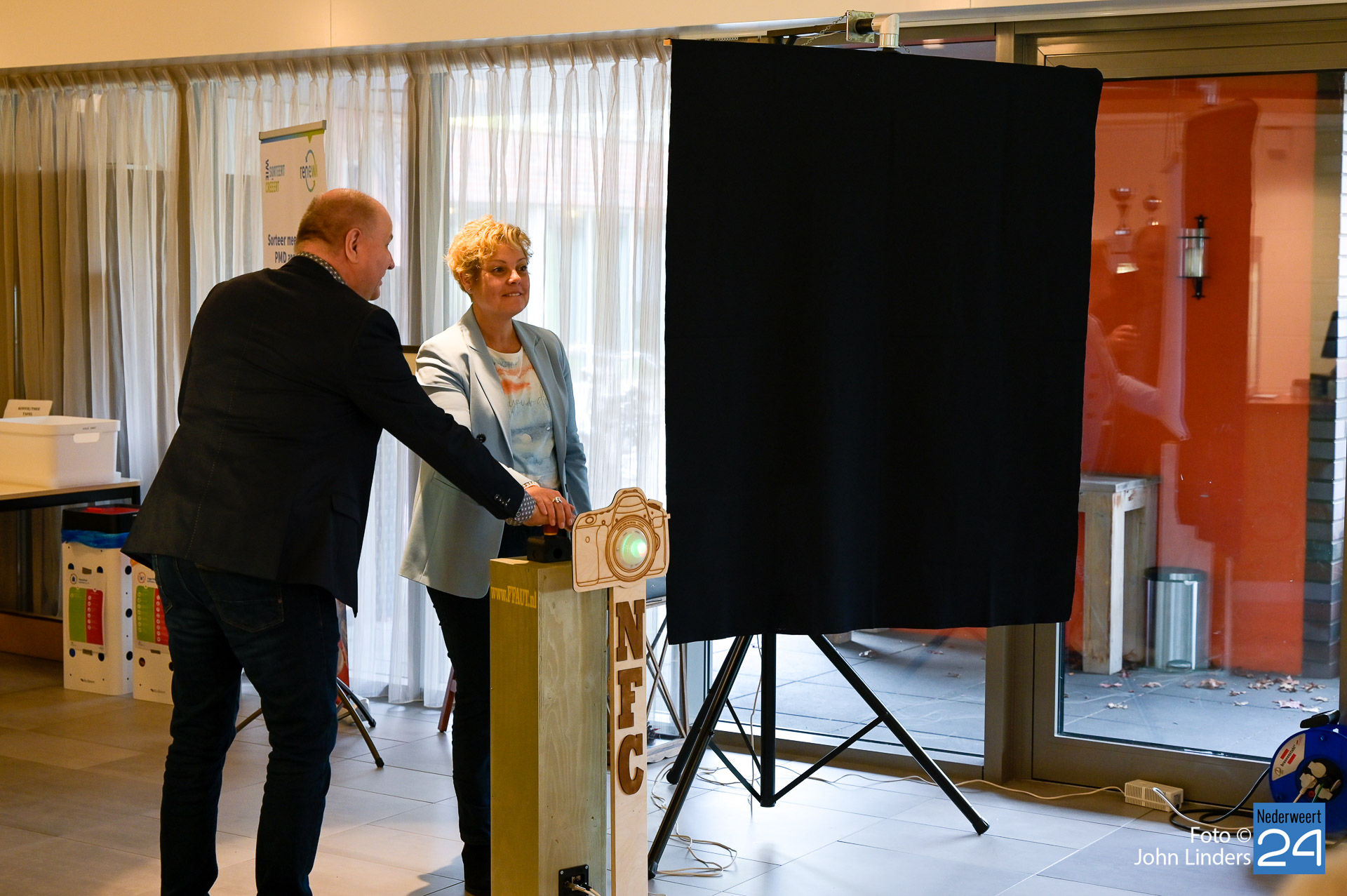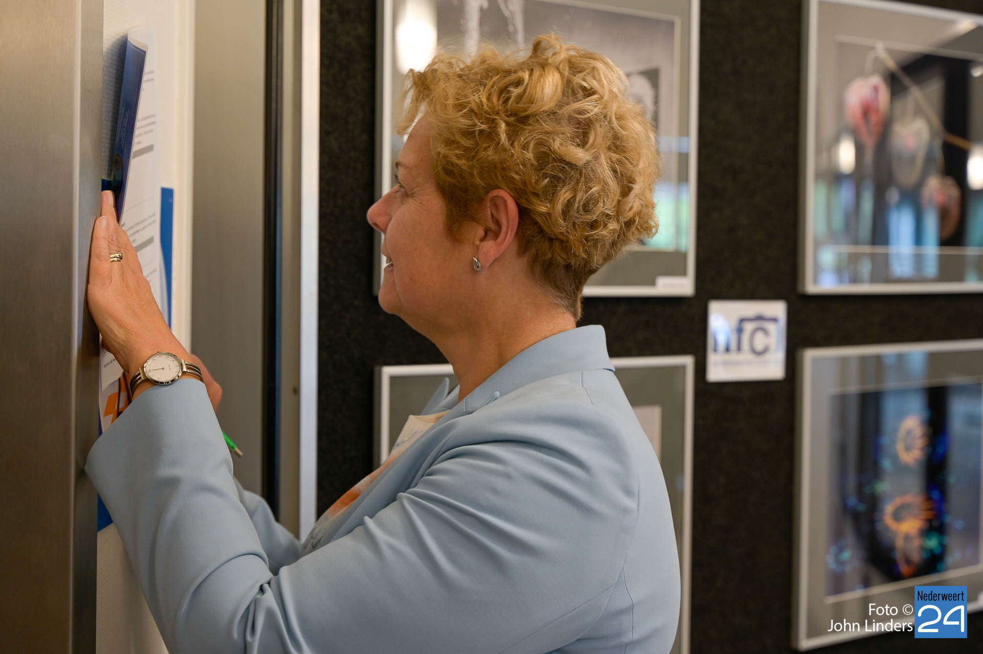 Daarna werd Carla uitgenodigd om de 45 aanwezige even toe te spreken en Carla haalde nog even aan dat er in het gemeentehuis van Nederweert op diverse plaatsen grote afdrukken hangen van foto’s die gemaakt zijn door leden van de Nederweerter fotoclub. Op haar werkkamer hangt er bijvoorbeeld een foto van een jongen die leunend tegen de muur kijkt naar een andere jongen die voorbij komt rennen, Carla denkt hierbij dan aan de wereld om haar heen die constant in beweging is. Vervolgens was het tijd voor de officiële opening en dit gebeurde door voorzitter Cor Verboogen samen met Carla door op de rode knop te slaan en een poster met de twaalf foto’s van de maand te onthullen.