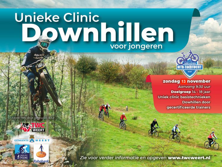 Wil je deelnemen aan een clinic op zondag 13 november, geef je dan op door een bericht te sturen naar fietsclinic@twcweert.nl onder vermelding van je NAW gegevens en geef aan of je aan de Kids clinic of de clinic Downhillen wil deelnemen. Aan de clinic zijn geen kosten verbonden doordat de clinics worden mogelijk gemaakt door een unieke samenwerking van TWC Weert met Limburg Cycling, Gemeente Weert en Rabobank Limburg.