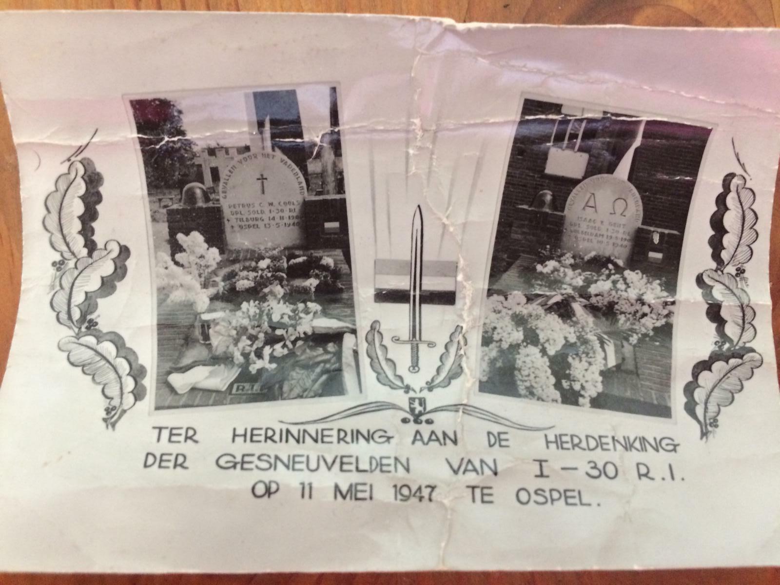 Rond Allerzielen jl. ontmoette ik op het Ospels kerkhof een Brabants echtpaar op leeftijd. De man nam aandachtig kennis van het oorlogsmonument. Hij vroeg naar de graven van twee in Ospel gesneuvelde militairen en waarom zij niet vermeld zijn op het monument. Hij begreep dat er alleen de Ospelse oorlogsslachtoffers zijn genoemd. Maar de graven van de twee gesneuvelde Nederlandse soldaten? Hij kende zelfs hun namen Peter Cools en Izaäk van Gent en vertelde me zijn verhaal.