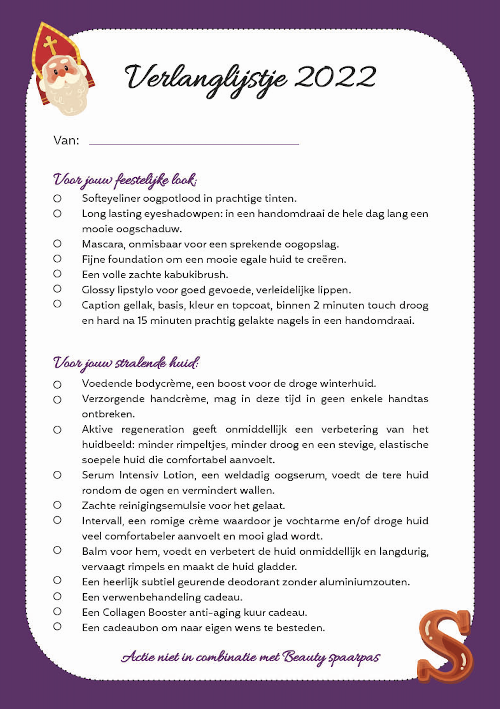 En bij Sinterklaas horen natuurlijk verlanglijstjes. Om het je gemakkelijk te maken, hebben we alvast een verlanglijstje voor jou geschreven. Je hoeft alleen nog maar aan te kruisen wat je wilt hebben van de Sint! En het mooie is, Sint krijgt 10% korting op alles wat op het verlanglijstje staat!
