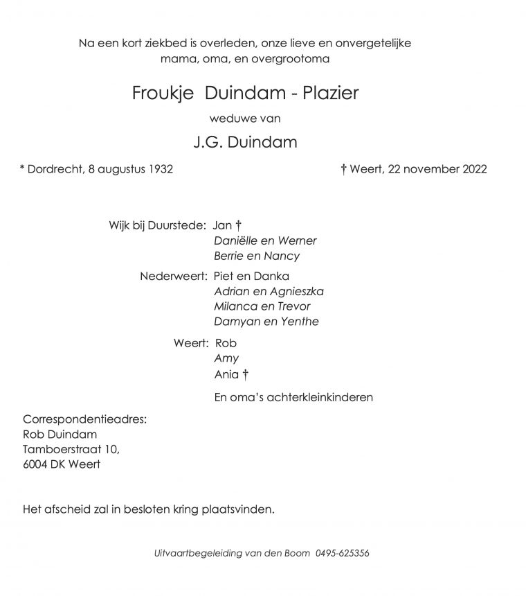 Overlijdensbericht: Froukje Duindam – Plazier †