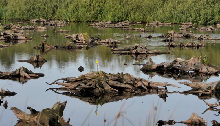 Zo ook in het Meerbaansblaak, een waterplas aan de rand van De Groote Peel. Misschien wel een van de meest bekende plekken in het gebied. Vernoemd naar de Peelbaan waar vroeger uitgegraven turf over afgevoerd werd: de Meerbaan. Het water stroomt te snel weg naar de ondergrond, waardoor de plas in de zomer vaak deels droog komt te liggen. De karakteristieke stukken kienhout steken dan boven het water uit. Voor een herstellend hoogveen is een stabiel waterpeil erg belangrijk. Daarom gaat Staatsbosbeheer begin december aan de slag met het dichtmaken van het ‘lek’ in de bodem. Veenmos, het plantje dat van essentieel belang is voor de vorming van hoogveen, zal profiteren van meer water en een stabiel waterpeil. Net als veel dieren zoals libellen, kikkers en andere soorten die in en om het water leven.