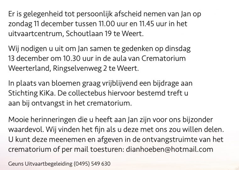 Jan bedankt dat je z’n liefde volle schoon vader was voor onze zoon, z’n lieve opa voor onze kleinkinderen, jan bedankt voor alles wat je voor de kinderen gedaan hebt je stond altijd voor hun klaar, jan bedankt dat we je hebben leren kennen als een geweldige man, jan het gaat je goed daar boven er zal een mooie ster schijnen.