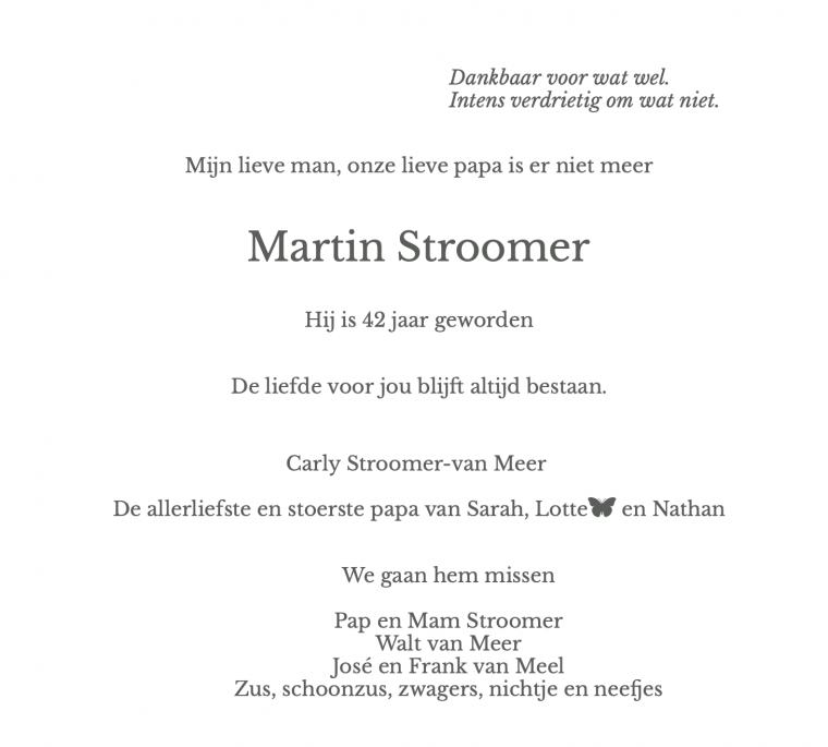 Fam.Stroomer Gecondoleerd met het verlies van Martin,Wens Carly en de kids heel veel sterkte en kracht toe in deze zeer moeilijke tijd