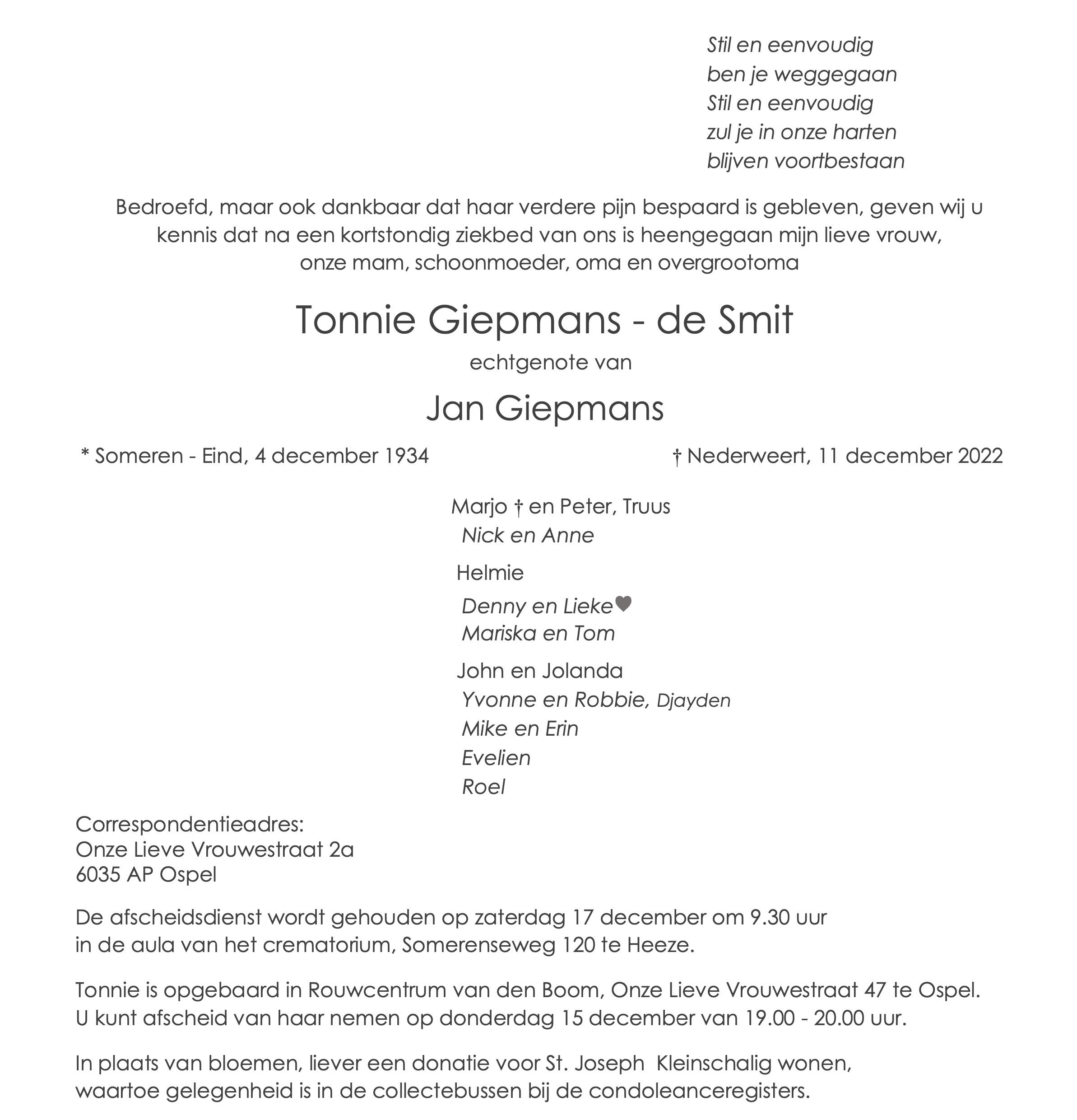 Overlijdensbericht: Tonnie Giepmans – de Smit †