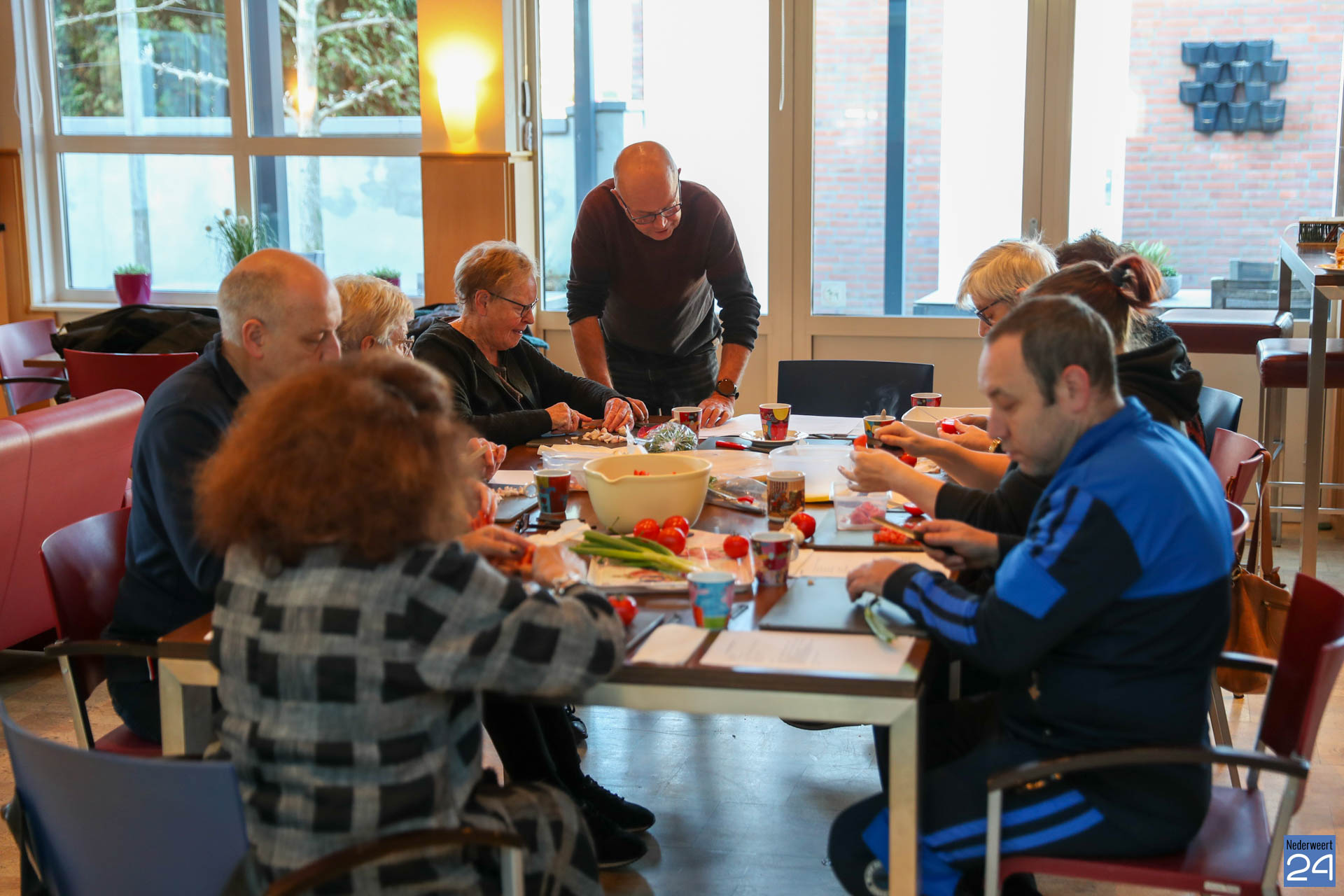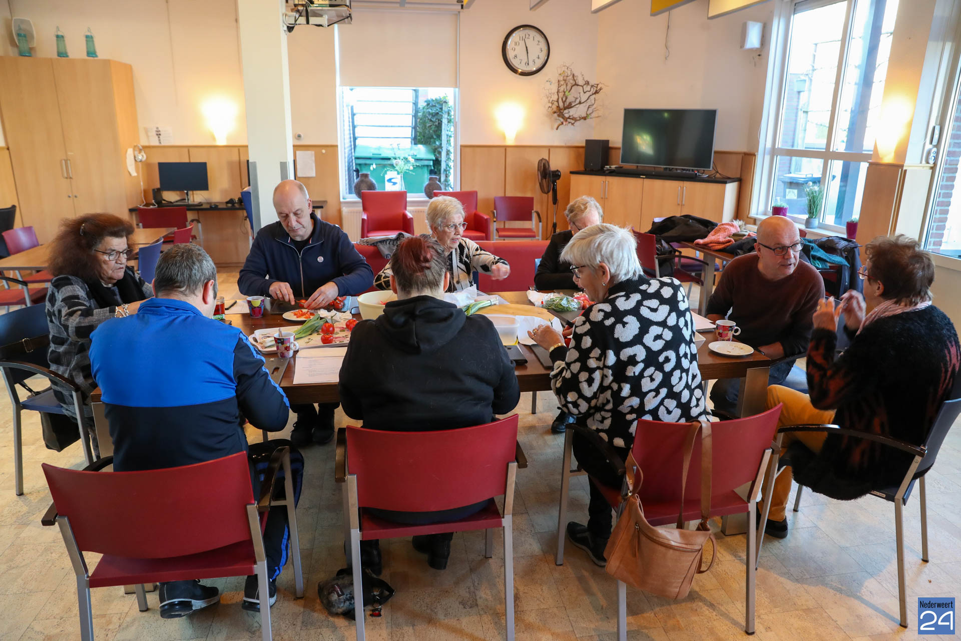 In het begin is het nog wat onwennig, maar naarmate de tijd verstrijkt ontstaan er gezellige gesprekken tussen de dames en heren aan tafel. Over wederzijdse kennissen, of gebeurtenissen in de omgeving, of gewoon over het samen koken. Er is geen onderscheid. Iedereen doet mee. Als het tijd is om de ingrediënten in de pan te doen, is er ruimte voor langere gesprekken. En als de soep dan ten slotte wordt geserveerd om samen op te eten, is dat voor sommigen eigenlijk nog te vroeg. Ze waren nog lang niet uitgepraat. Komen ze terug de volgende keer? “Jazeker, dan zijn we er weer bij”, antwoorden ze. Allen met in de handen een bakje eigengemaakte soep, om thuis lekker van te smullen.