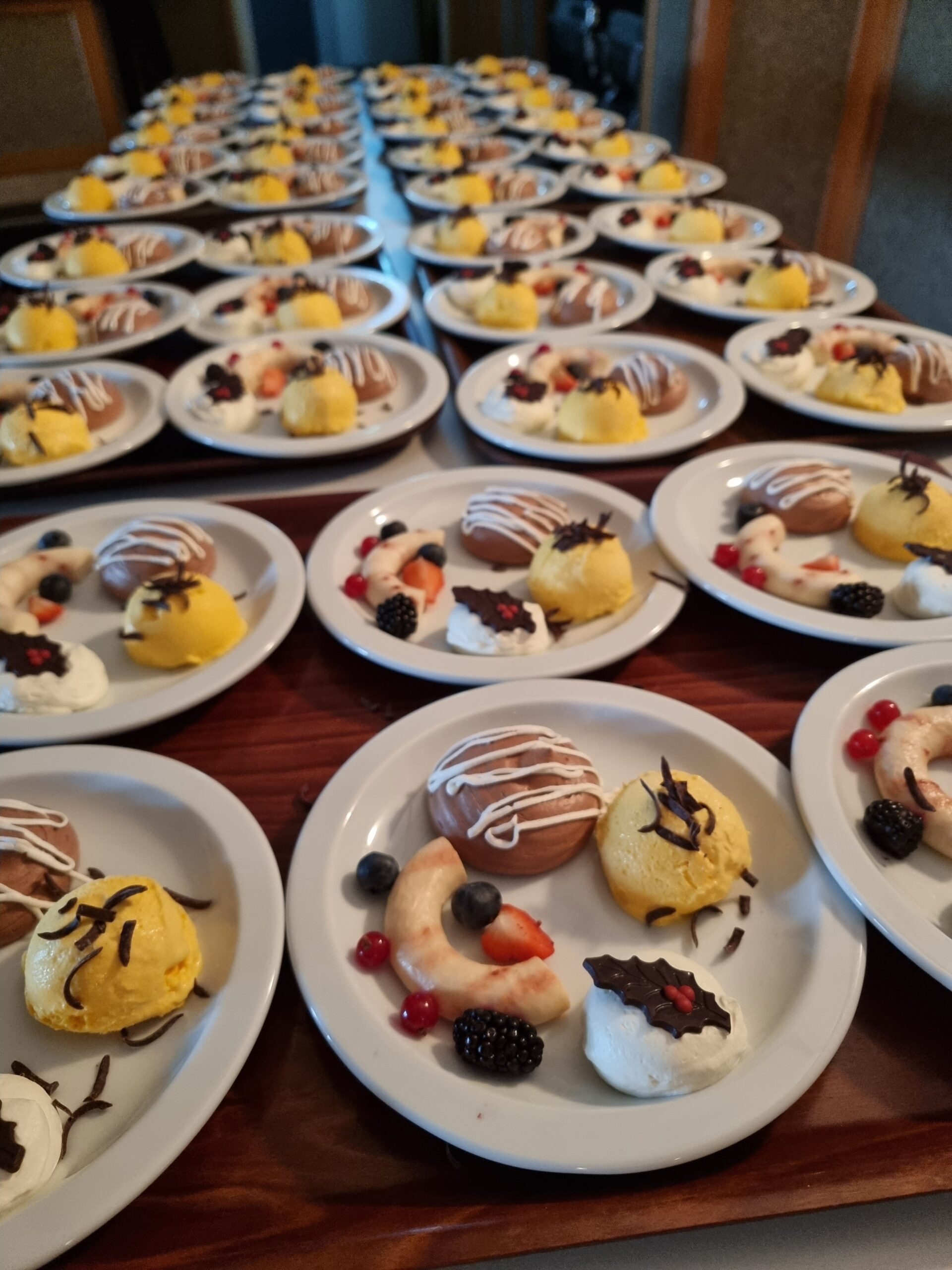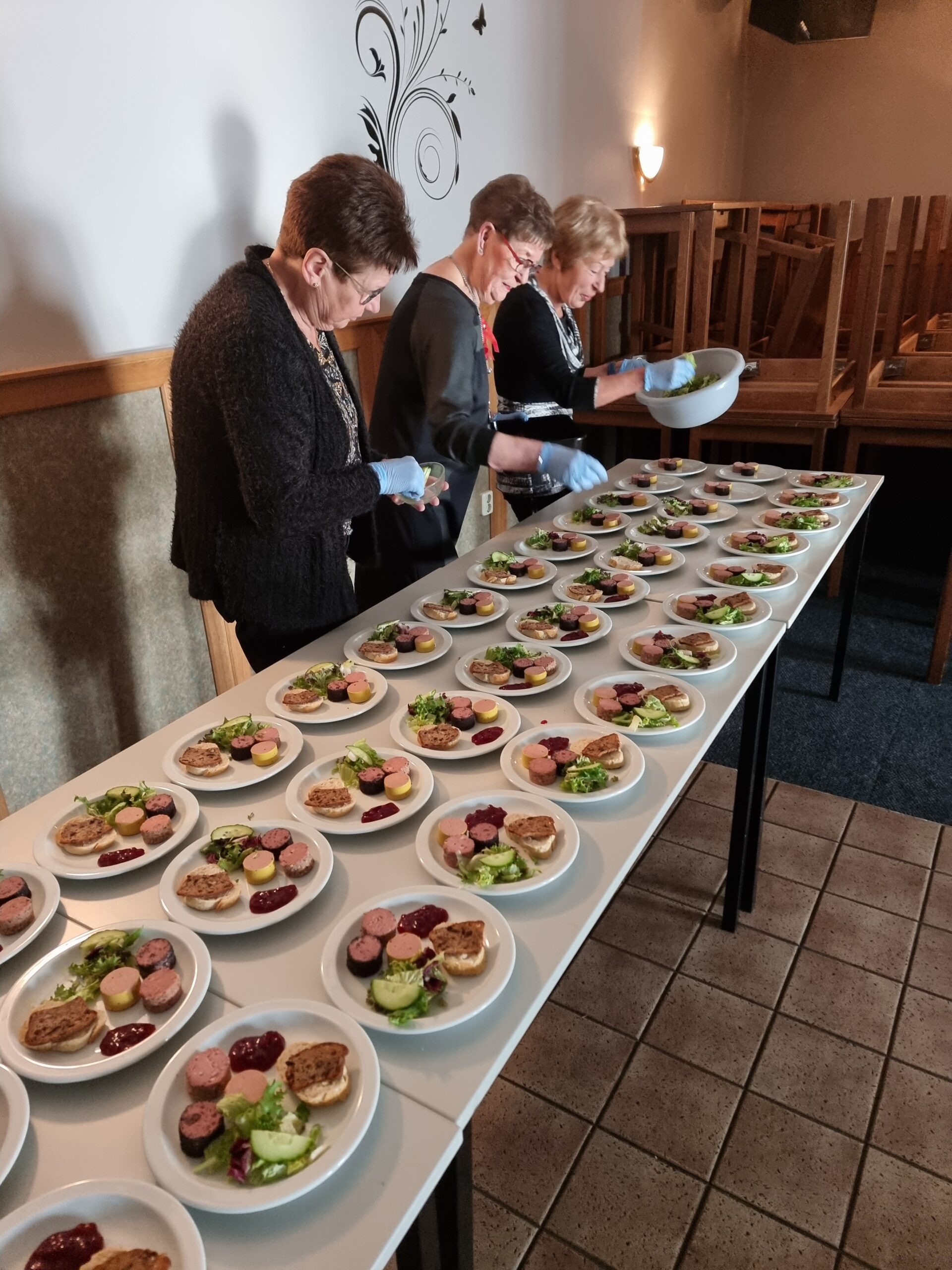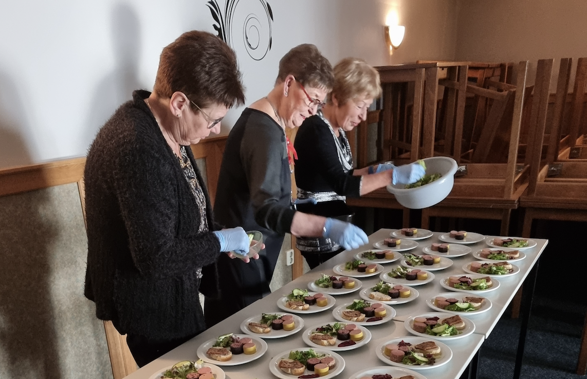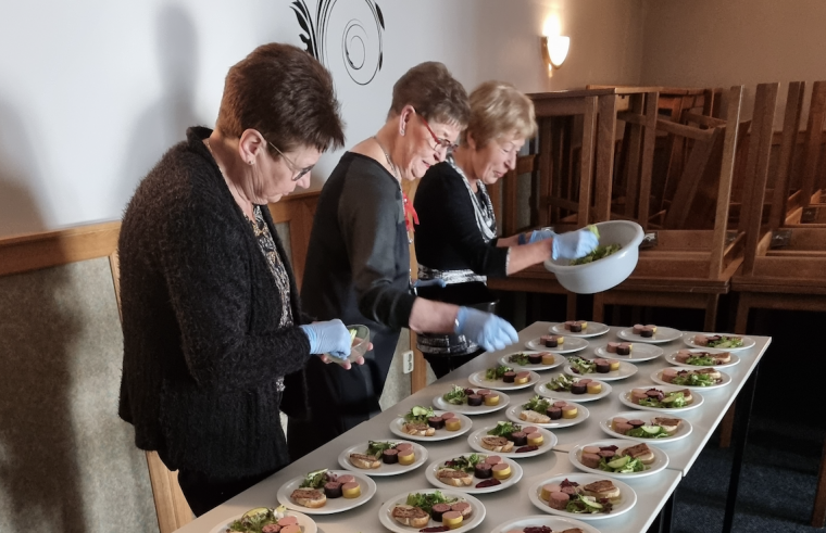 Het eten werd door Frans en Désirée van Nieuwenhoven bereidt. Ook was de zaal mooi versierd. De vrijwilligers zorgden er weer voor dat de tafels mooi gedekt waren en serveerden het eten aan de tafels. De gasten hebben genoten van een heerlijk 4-gangen kerstdiner.