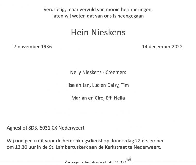 Fam. Hein Nieskens, gecondoleerd met het overlijden. Veel sterkte gewenst !