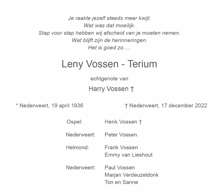 We wensen jullie heel veel sterkte met het verlies van jullie moeder schoonmoeder en oma. Moge de mooie herinneringen aan haar altijd blijven voortbestaan.