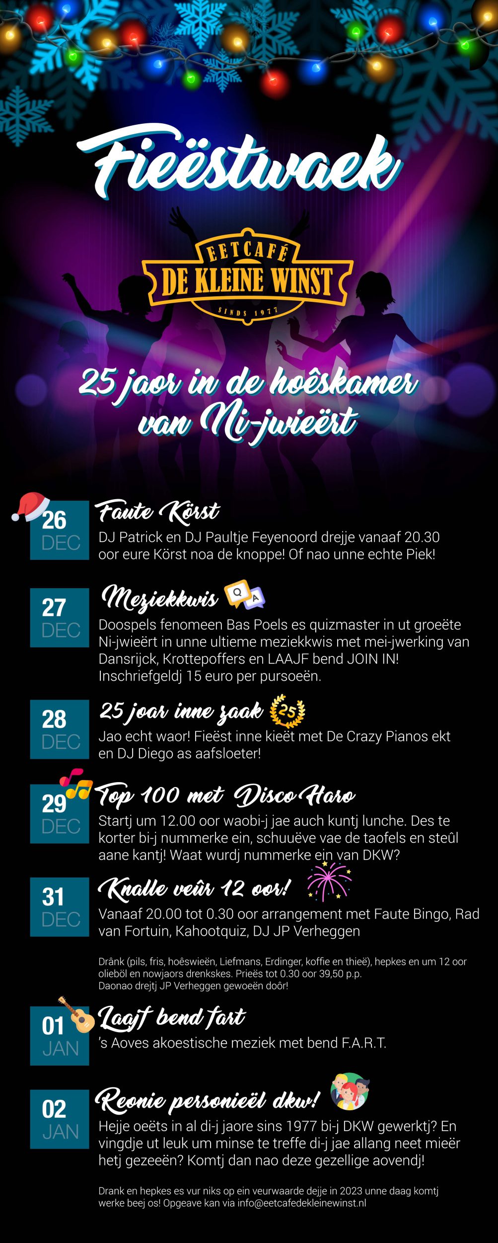 Als afsluiting van de jubileumweek vindt een heuse reünie van het personeel van DKW plaats. Heb je ooit in al die jaren sinds 1977 deel uitgemaakt van het team van De Kleine Winst? En vind je het leuk om mensen te treffen die je al lang niet meer hebt gezien? Kom dan naar deze gezellige avond. “Drank en hepkes es vur niks op ein veurwaarde dejje in 2023 unne daag komtj werke beej os! Opgeave kan via info@eetcafedekleinewinst.nl.”