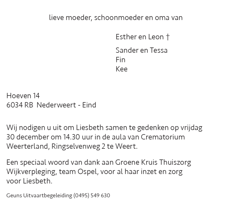 Gecondoleerd met het overlijden van Liesbeth.. Ik wens jullie voor de komende tijd heel veel sterkte, maar voor de toekomst ook vele mooie herinneringen aan Liesbeth, mam en oma.