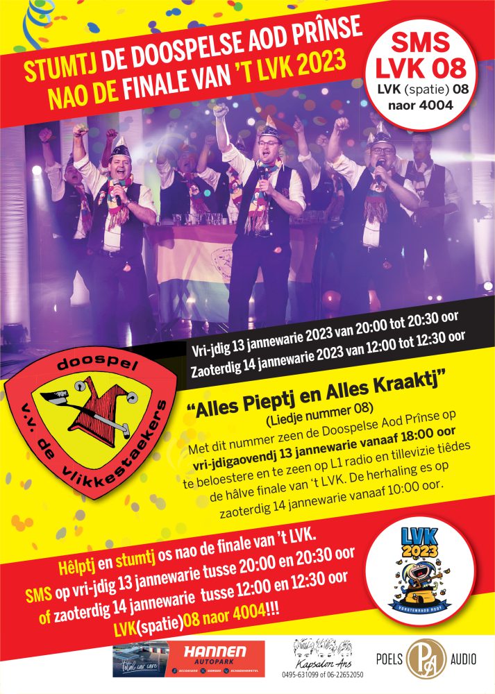 Op vrijdag 13 januari zijn de Doospelse Aod Prînse als 8e te zien in de eerste halve finale van het LVK. Deze wordt van 18:00 uur tot 20:00 uur uitgezonden op L1. Van 20:00 uur tot 20:30 uur mag er gestemd worden. Dit doe je door te SMS-en naar 4004 met de tekst LVK 08 (LVK spatie 08).