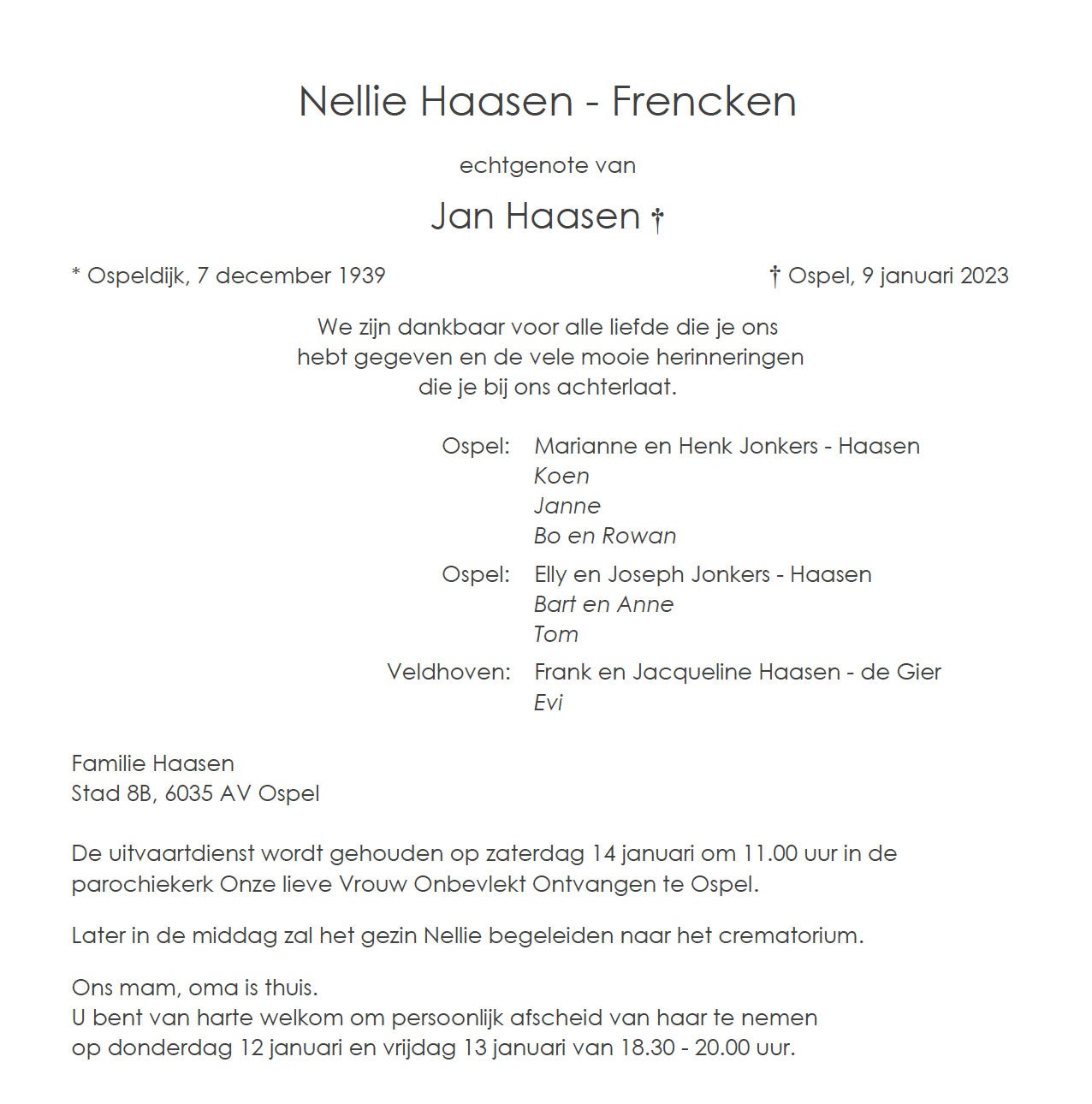 Overlijdensbericht: Nellie Haasen – Frencken †