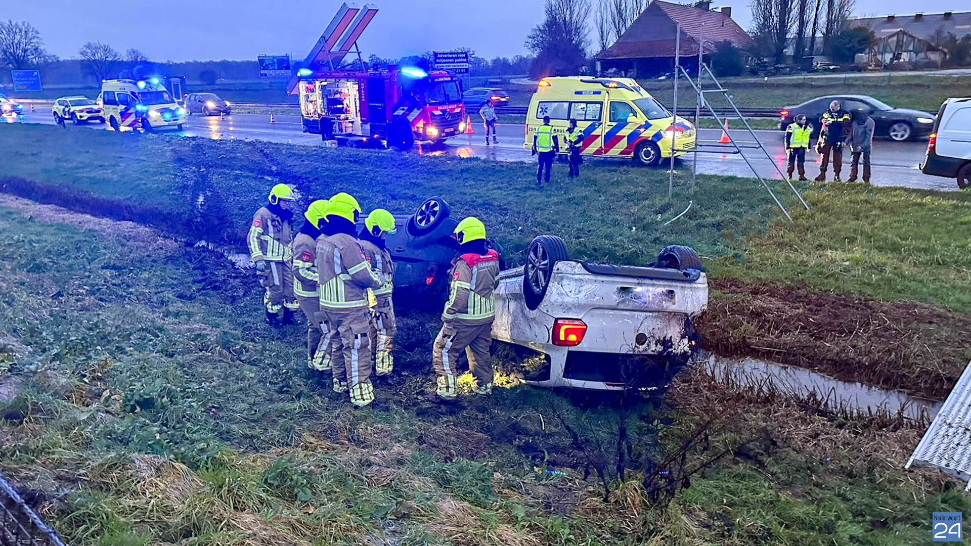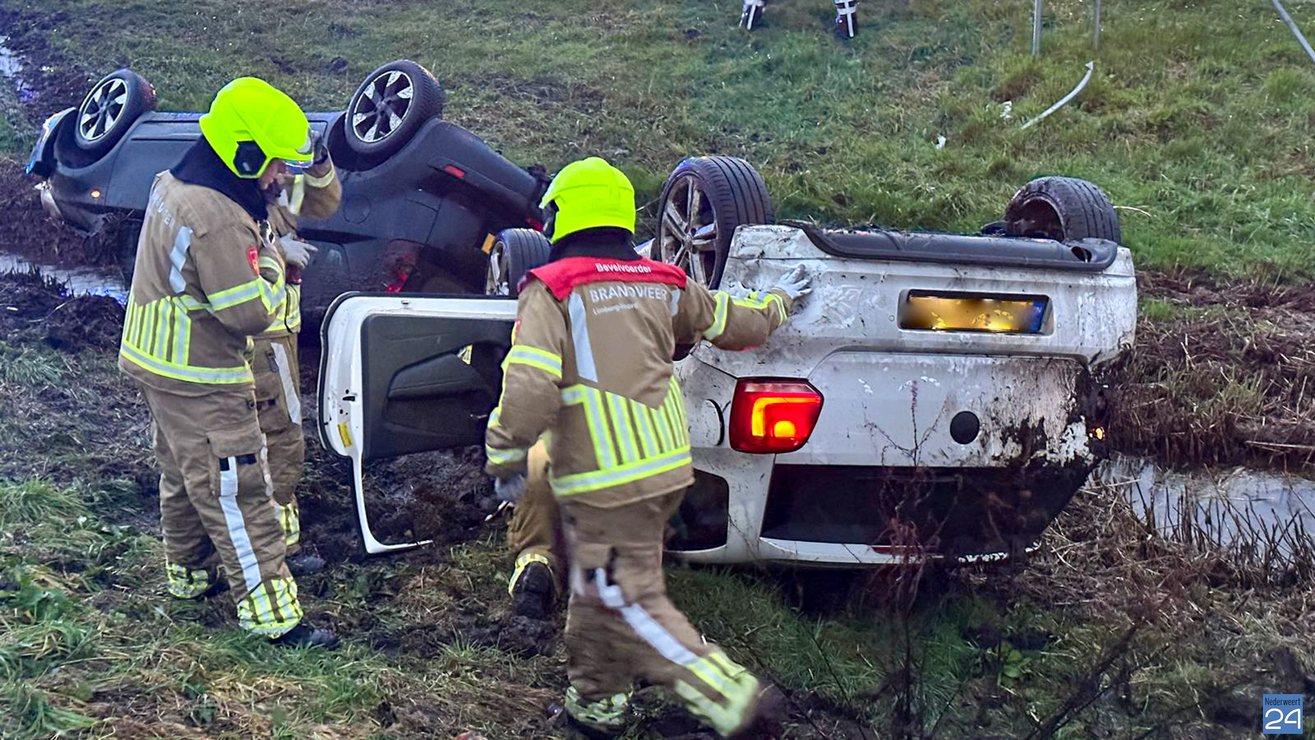 Twee personenauto’s raakten door onbekende oorzaak van de weg en belandden beide op de kop in de naastgelegen sloot. Beide inzittenden konden hun voertuigen op eigen kracht verlaten. Of ze gewond zijn geraakt is niet bekend.