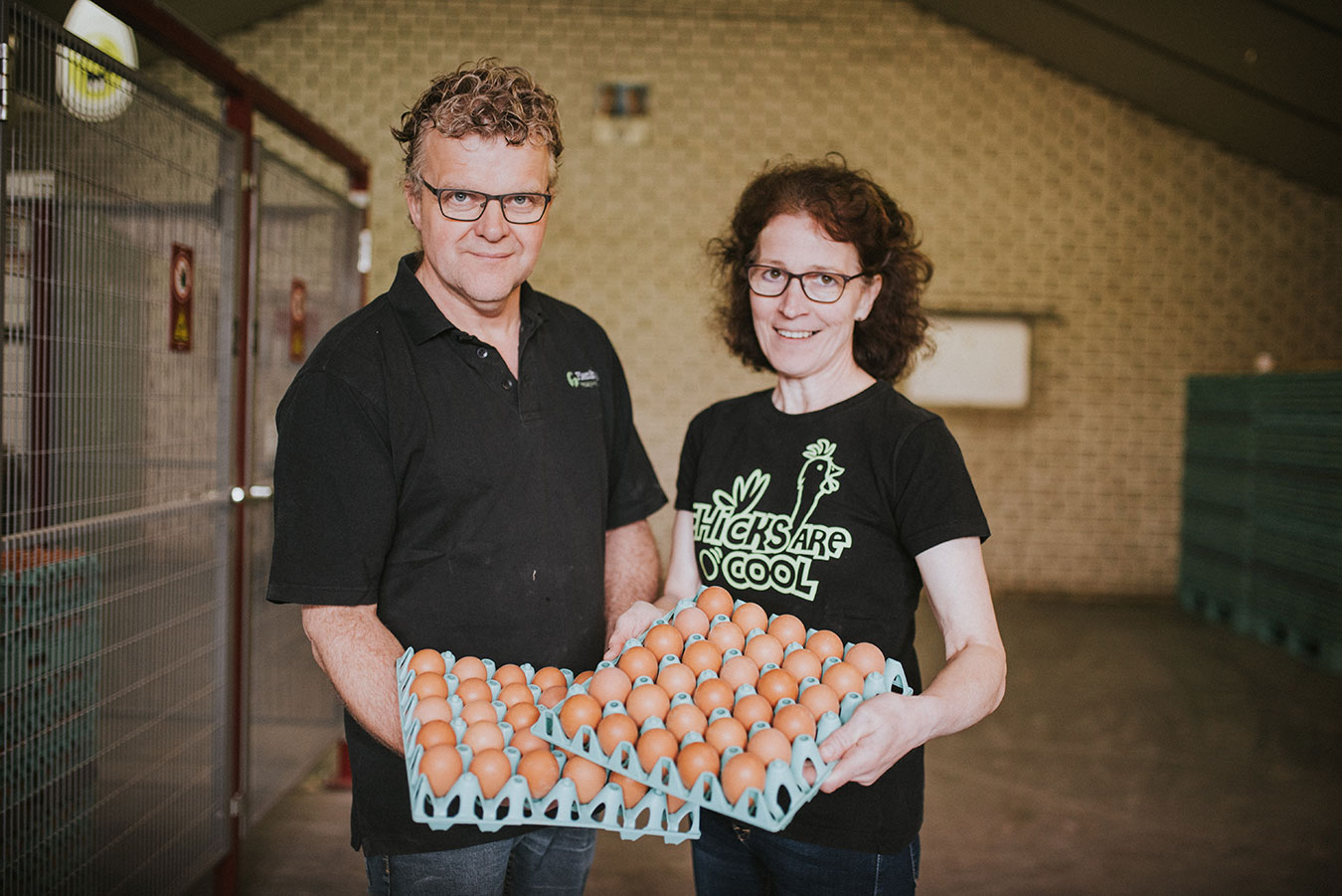 Het familiebedrijf van Adri en Annelies bestaat al sinds 1900 toen overgrootopa Jel het bedrijf oprichtte. Opa Sjang en vader Pierre namen het stokje over, Adri zette de familietraditie in 1990 voort en bouwde het kippenbedrijf aan de Nieuwstraat verder uit. Al meer dan 30 jaar zet Adri zich in voor het bedrijf. “Een mooi scharrelei produceren, daar ga ik voor en daar geniet ik nog elke dag van.” Naast hun reguliere afzet verkopen Adri en Annelies in hun eierautomaat aan de Nieuwstraat de heerlijke eieren welke door hun kippen gelegd zijn. De vraag luidt dan ook als volgt: