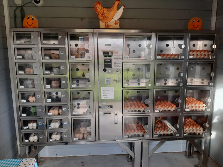 Hoeveel eieren liggen er, op onderstaande foto, in de eierautomaat van Adri en Annelies?