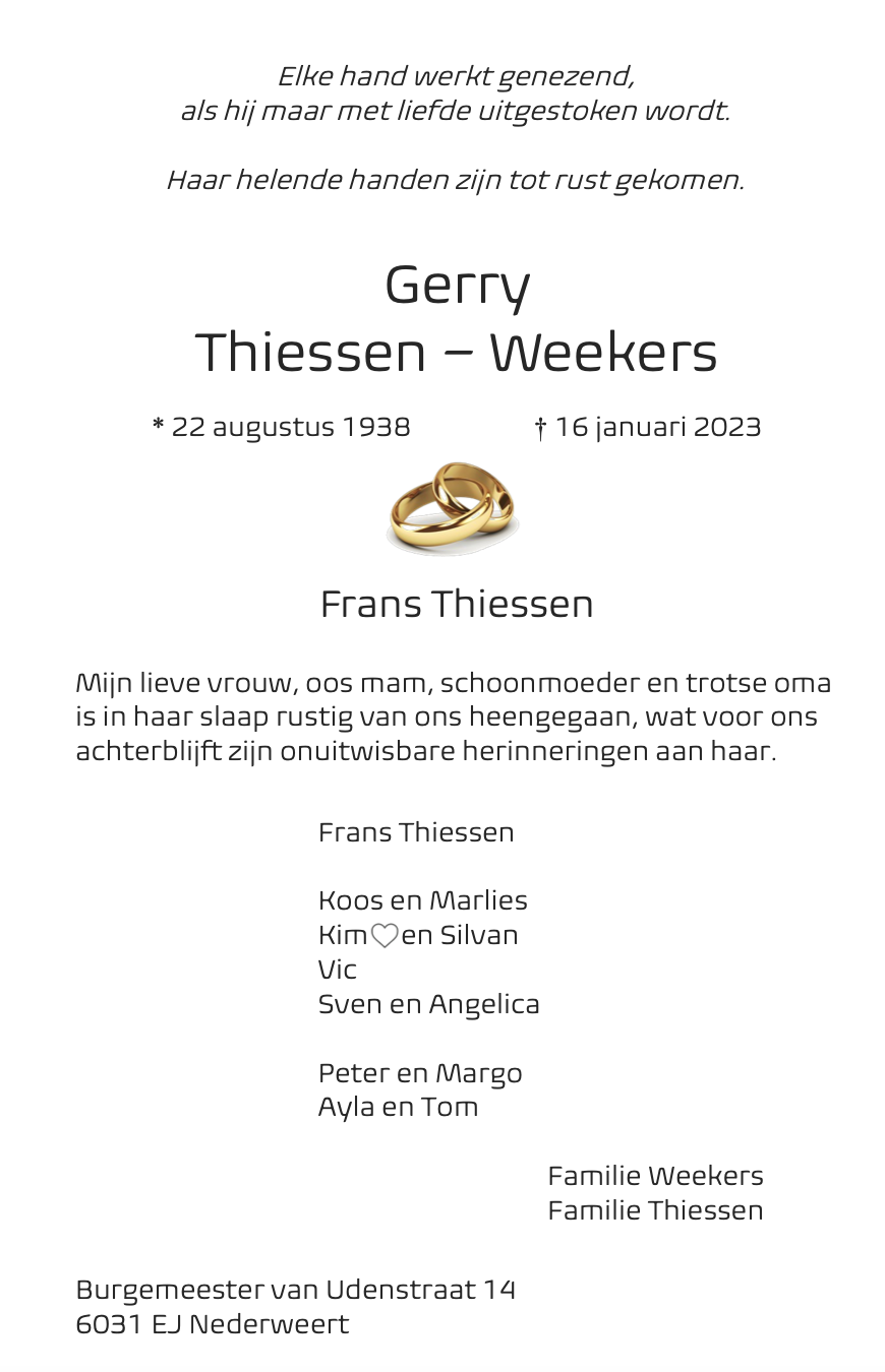 Overlijdensbericht: Gerry Thiessen – Weekers †