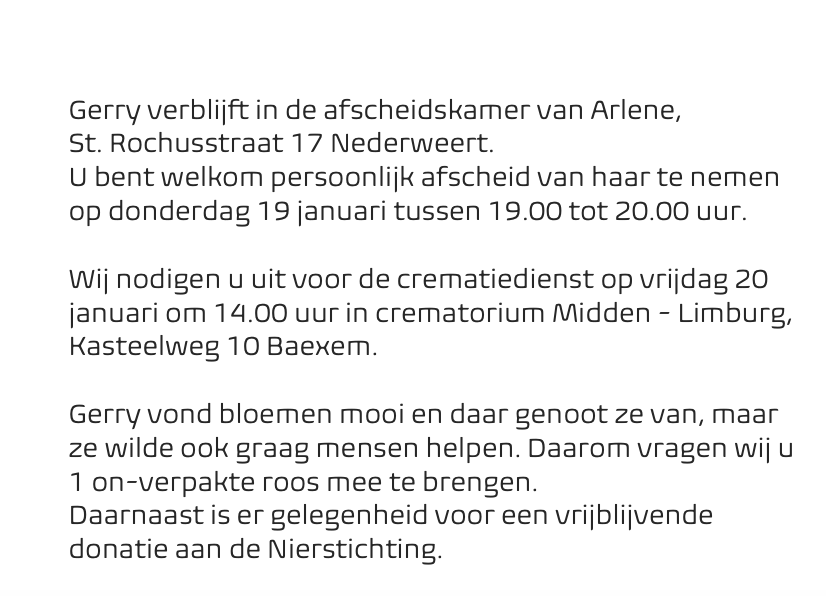 Frans en familie gecondoleerd met het overlijden van Gerry we wensen jullie heel veel sterkte voor nu en in de komende tijd