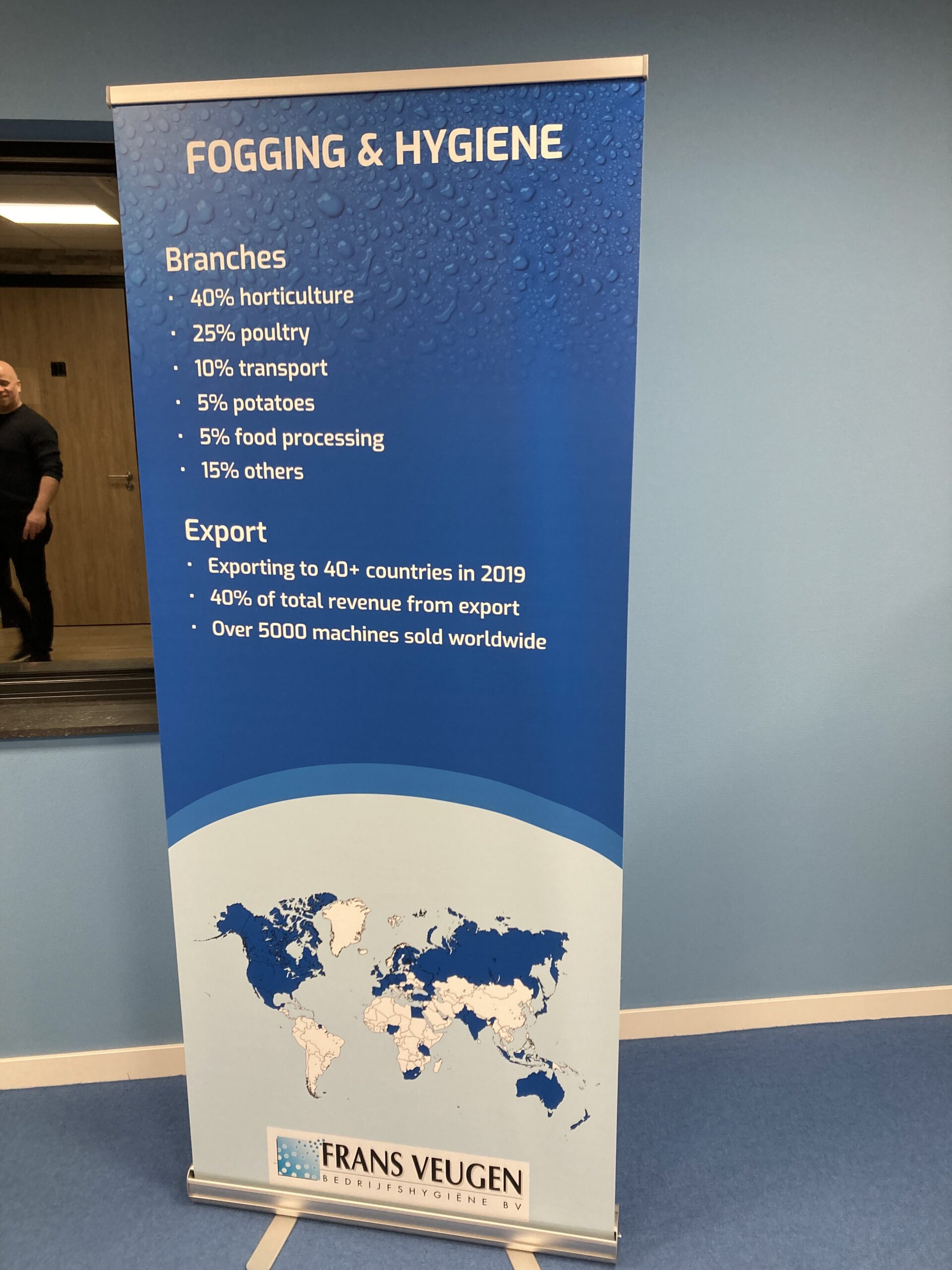 Frans Veugen Bedrijfshygiëne BV is gespecialiseerd in vernevelapparatuur. Deze apparaten produceren mist, bestaande uit water en biochemische toevoegingen, waarmee bijvoorbeeld stallen, kassen en vrachtwagens worden gedesinfecteerd. De grootste apparaten kunnen tot wel 10 hectaren in 1 uur desinfecteren. De belangrijkste branches zijn de glastuinbouw, de pluimvee en broederij en aardappelbewaring. De mist zorgt ervoor dat de aardappelen niet gaan kiemen en daardoor langer houdbaar blijven. Door de jaren heen zijn inmiddels ruim 7.000 apparaten aan de man gebracht. Ruim de helft van de omzet komt van over de grens, bijvoorbeeld uit de USA, Brazilië of Australië.