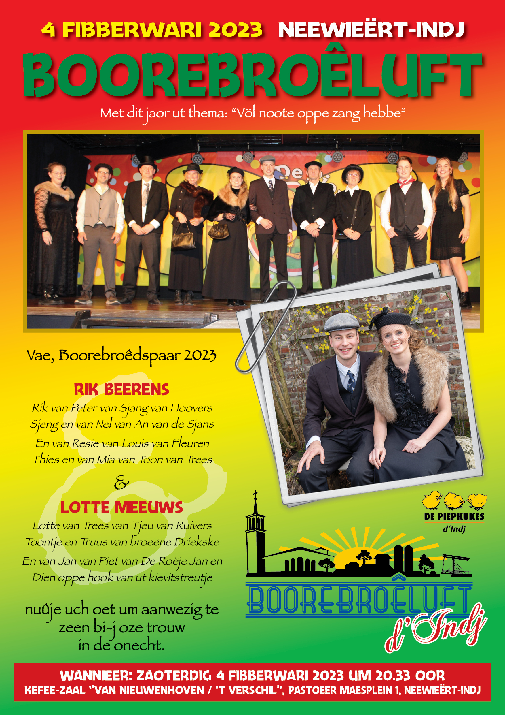 De “Borebroêleft” van de Piepkukes is een jaarlijks succesvol onderdeel van de d’Indjse vastelaovendj. Op zaterdag 4 februari 2023 vanaf 20.33 uur, zal dit heugelijke feit weer plaatsvinden. Boerenzoon Rik en de zorgzame Lotte zullen in het onecht verbonden worden bij Café-Zaal van Nieuwenhoven door de “ambtenaar” en ´t “pestuuërke”.