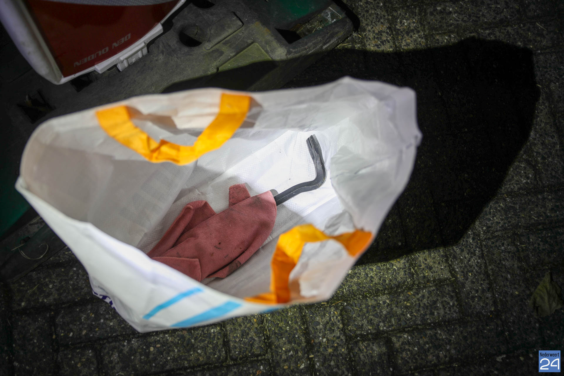 Een ‘Action-tas‘ met daarin de koevoet stond gewoon open en bloot op de parkeerplaats. De koevoet was aan het uiteinde omhuld met een handdoek.